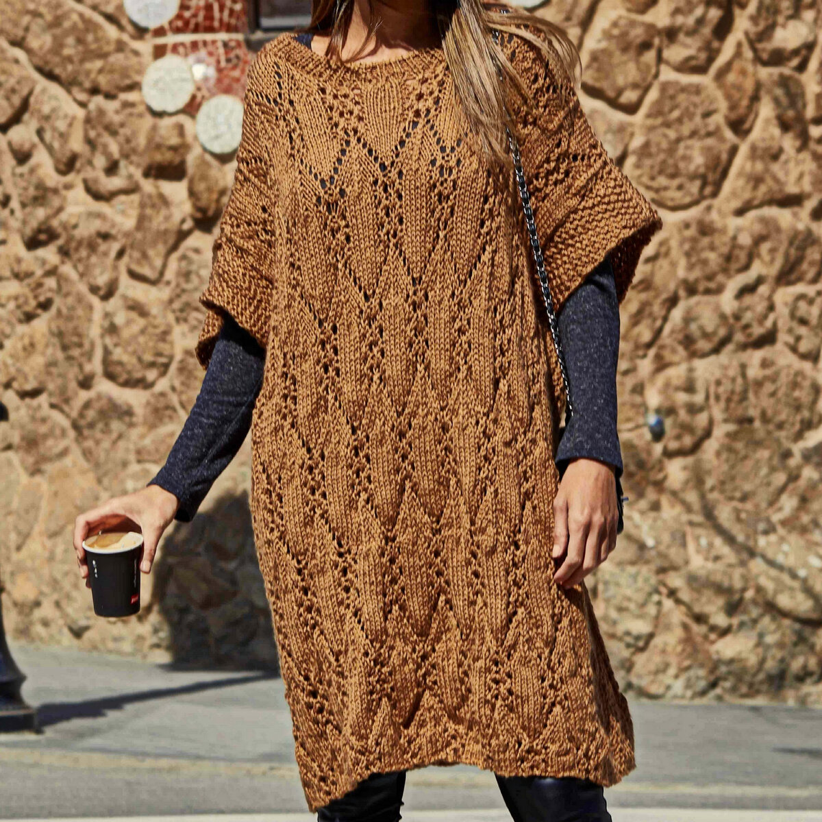 Нам понадобится 8 мотков — на универсальный оверсайз 44-48 — золотисто-коричневой пряжи: 30% шерсть, 70% акрил; 100 гр — 166 м. Спицы № 5-5,5.