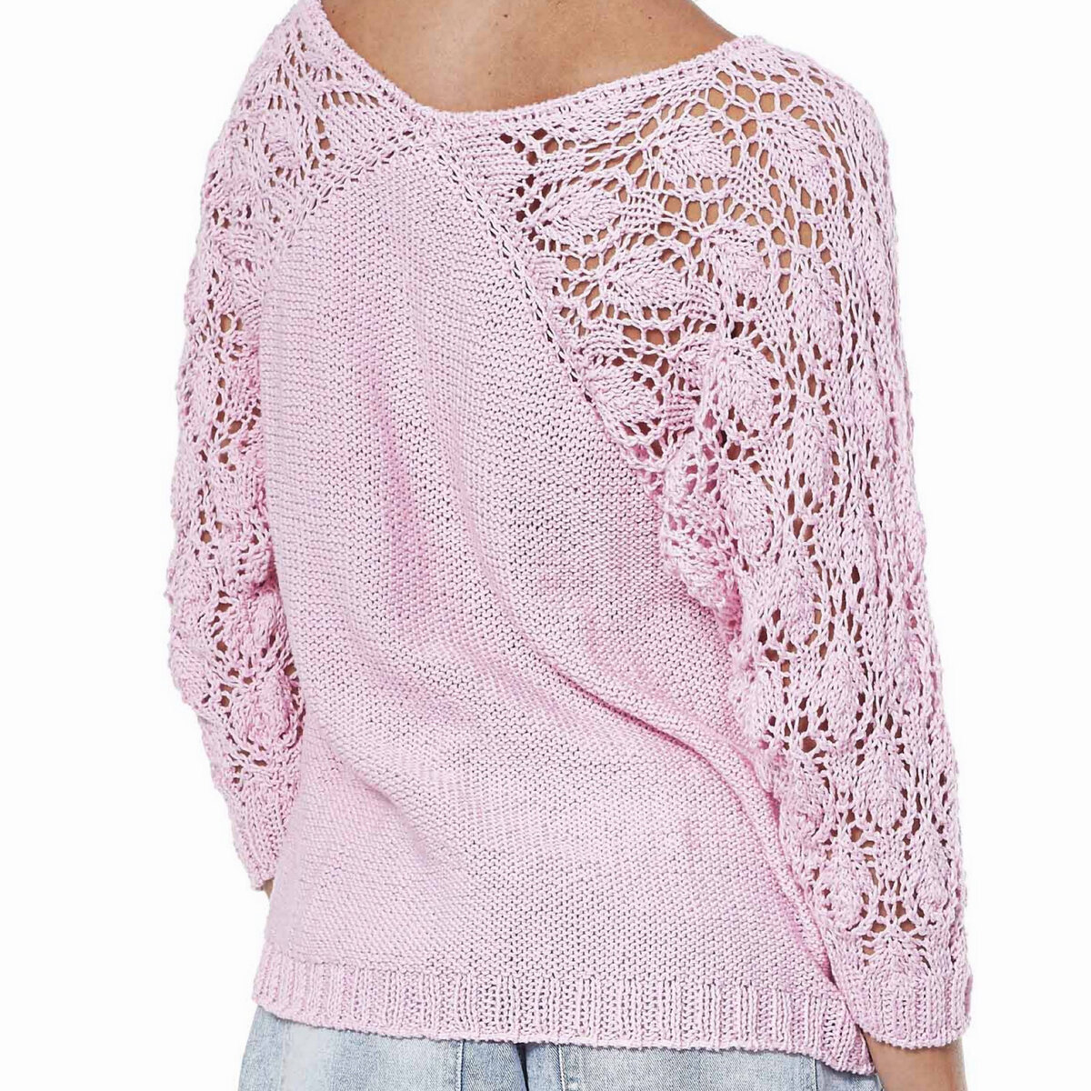 - 2. Вязать две детали поперечно: левый рукав и левую часть джемпера сеткой и правый рукав и правую часть джемпера крупным ажуром — сшить посередине.