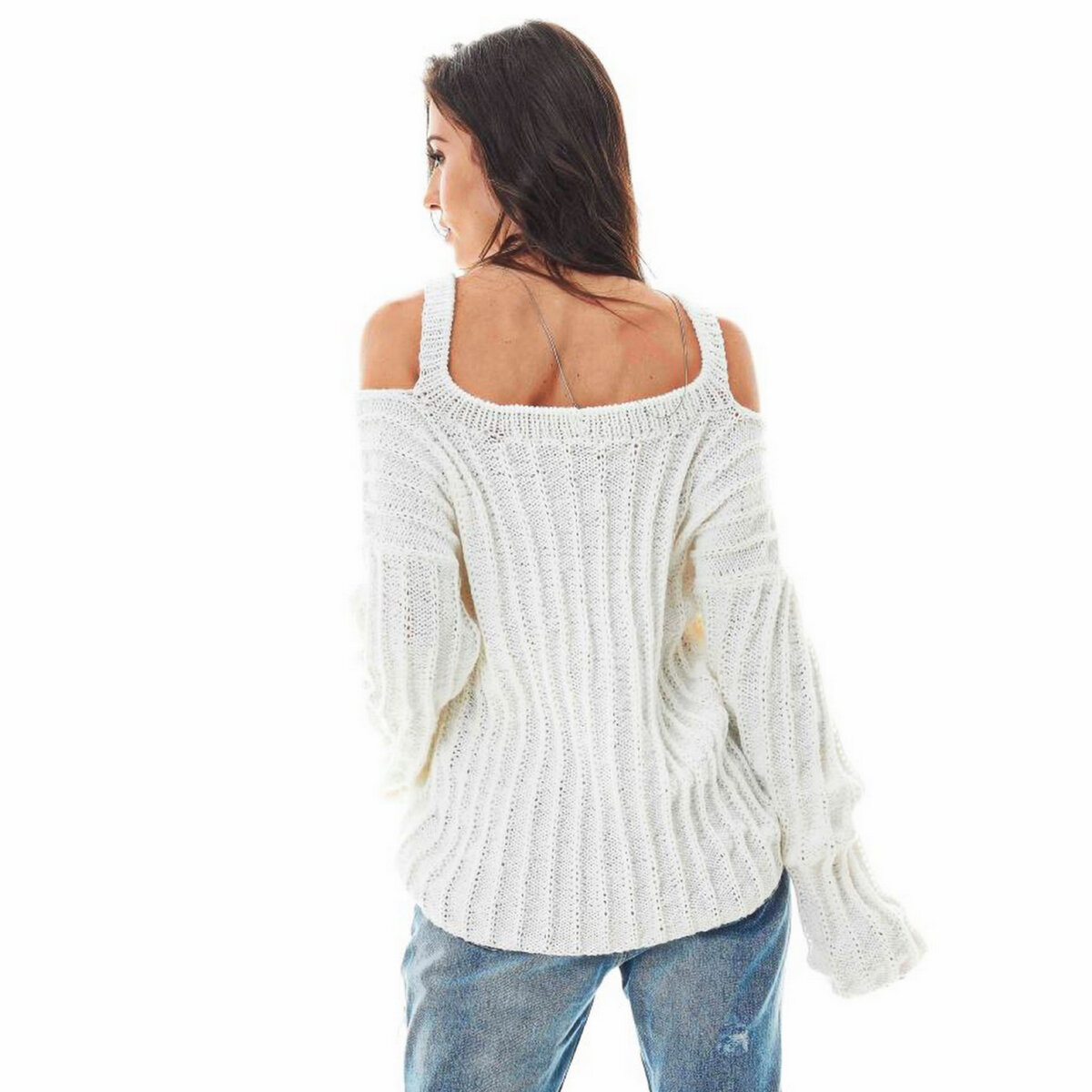 Молочный пуловер оверсайз на широких лямочках. Прямой фасон, открытые плечики, спущенный широкий рукав и глубокий V-образный вырез горловины.