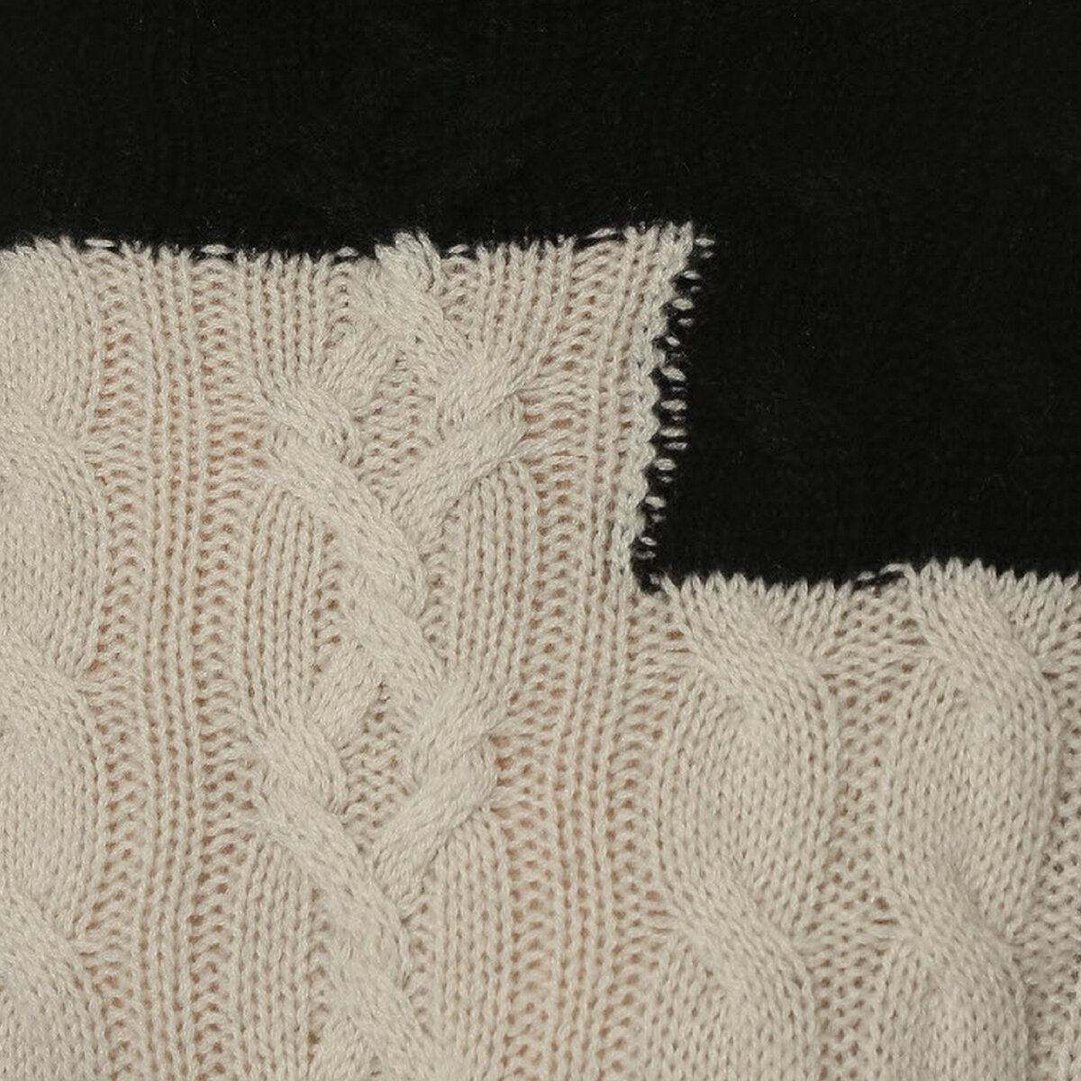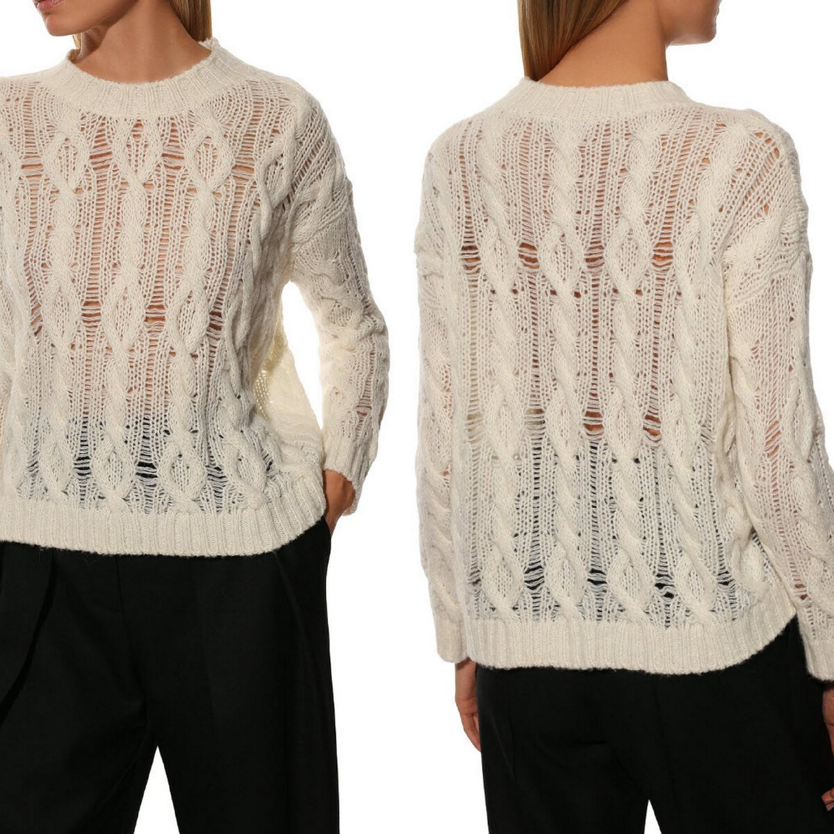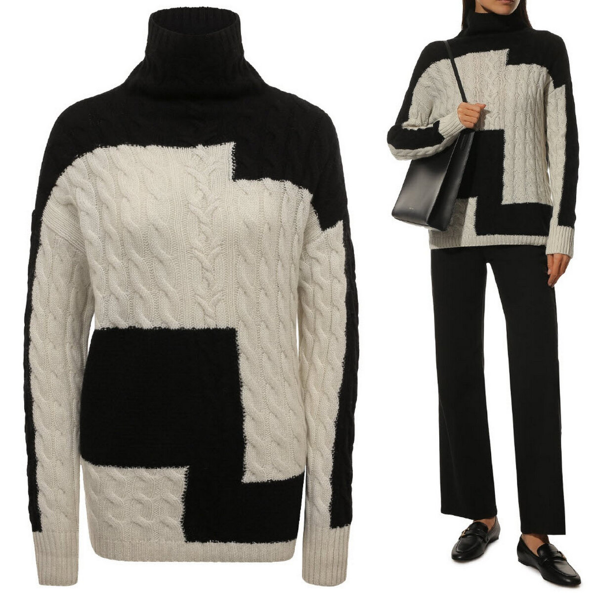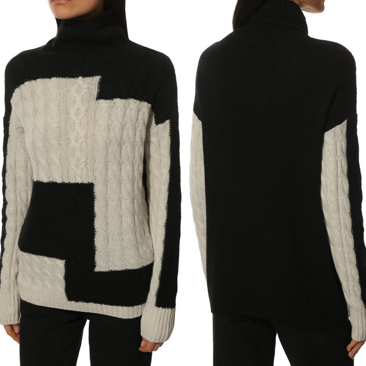 Чёрно-белый свитер с оригинальной подачей — необычный вариант привычного колор блока. Жгуты и арановые переплетения теряются на чёрном фоне, но зато отлично видны на молочно-белой части модели.
