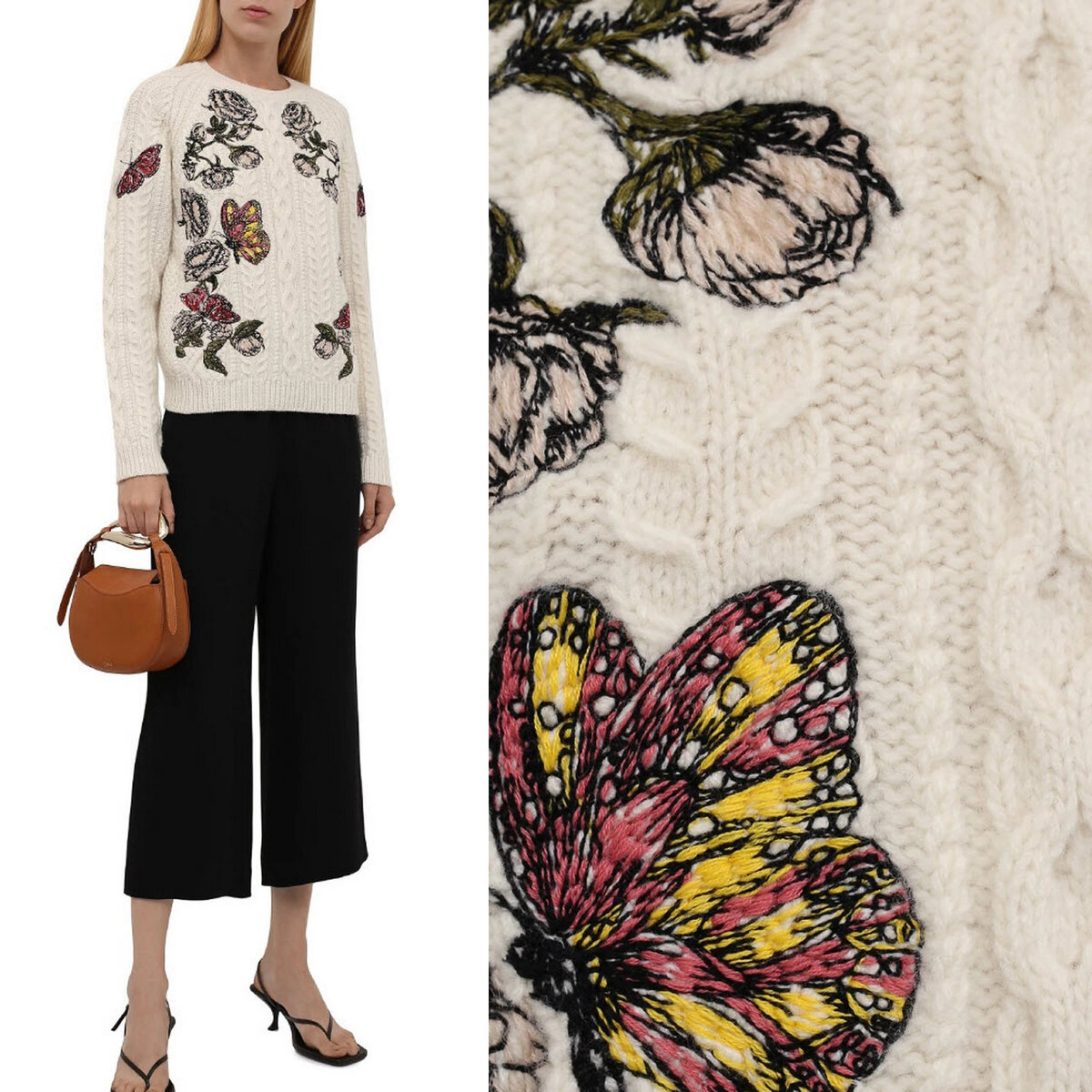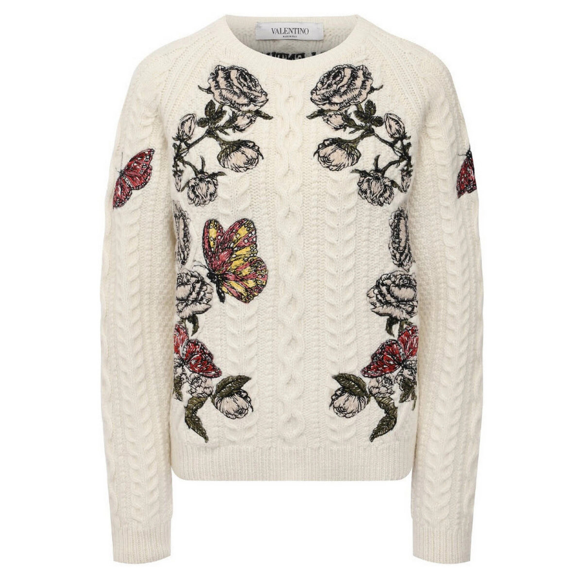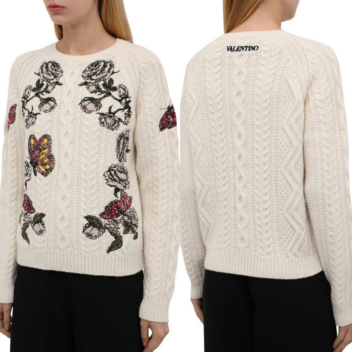 Тёплый свитер с аранами и жгутами, украшенный нежной цветочной вышивкой. Оригинальная модель от Valentino.