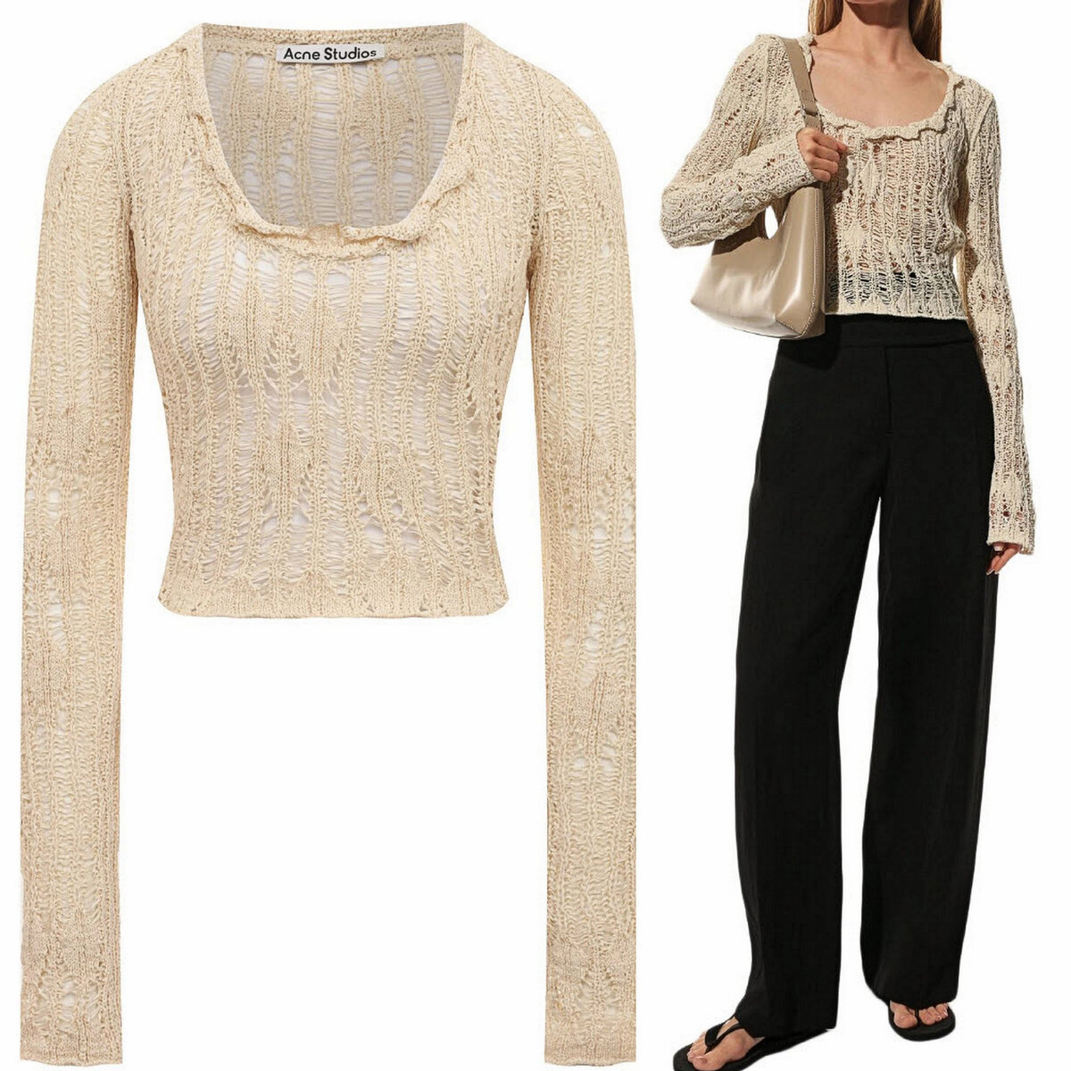 Слегка укороченная модель приятного кремового цвета, связанная из ленточной пряжи. Если кто-то ищет брендовые новинки для вдохновения, то это как раз тот вариант — нашла на сайте ЦУМа.