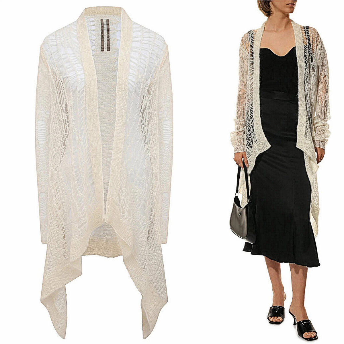 В кремовом кардигане Рик Оуэнс вывел на первый план фактуру. Асимметрично пропущенные петли создают эффект нарочитой небрежности и делают модель похожей на паутину. Для ее производства использовали тонкую пряжу из прочного нейлона, нежного шелковистого мохера и плотной шерсти.