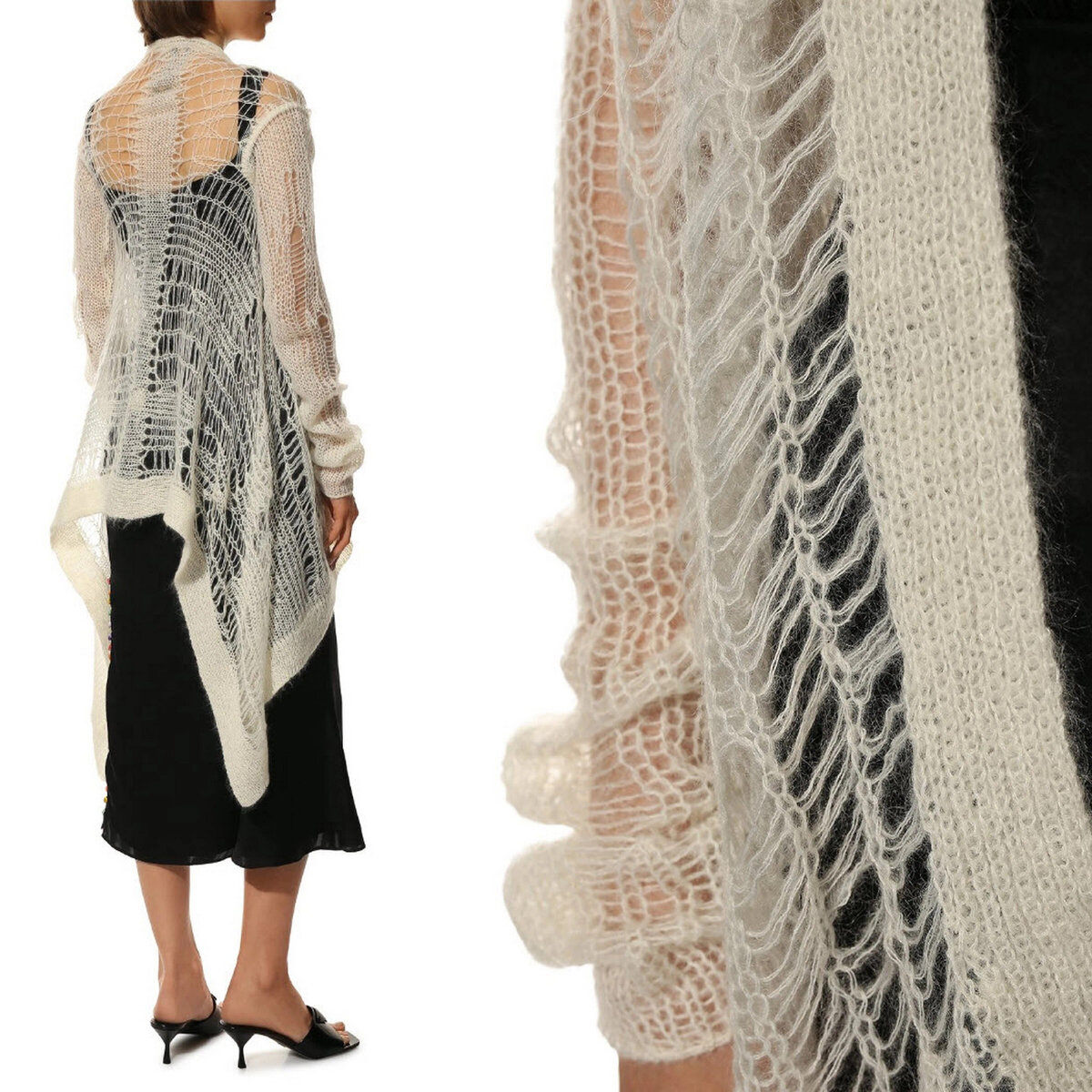 Продолжаем тему модной «рванинки». Вот такой оригинальный кардиган нашла на сайте ЦУМа. Здесь рвань мне даже нравится — смотрится нежно. Возможно, всё дело в мохере! Всё-таки паутинки как раз славятся своей дырявостью. По-моему, неплохая идея на осень.