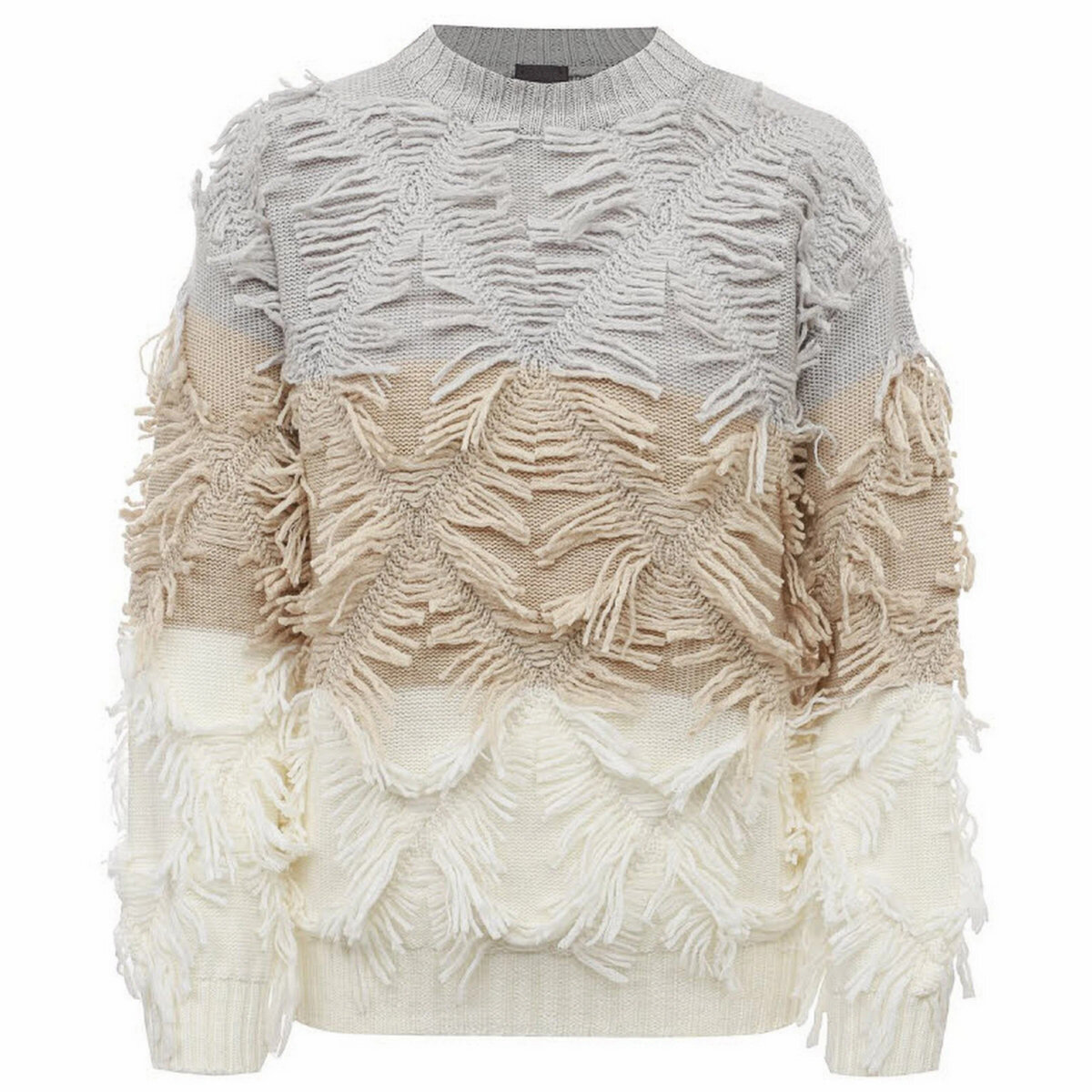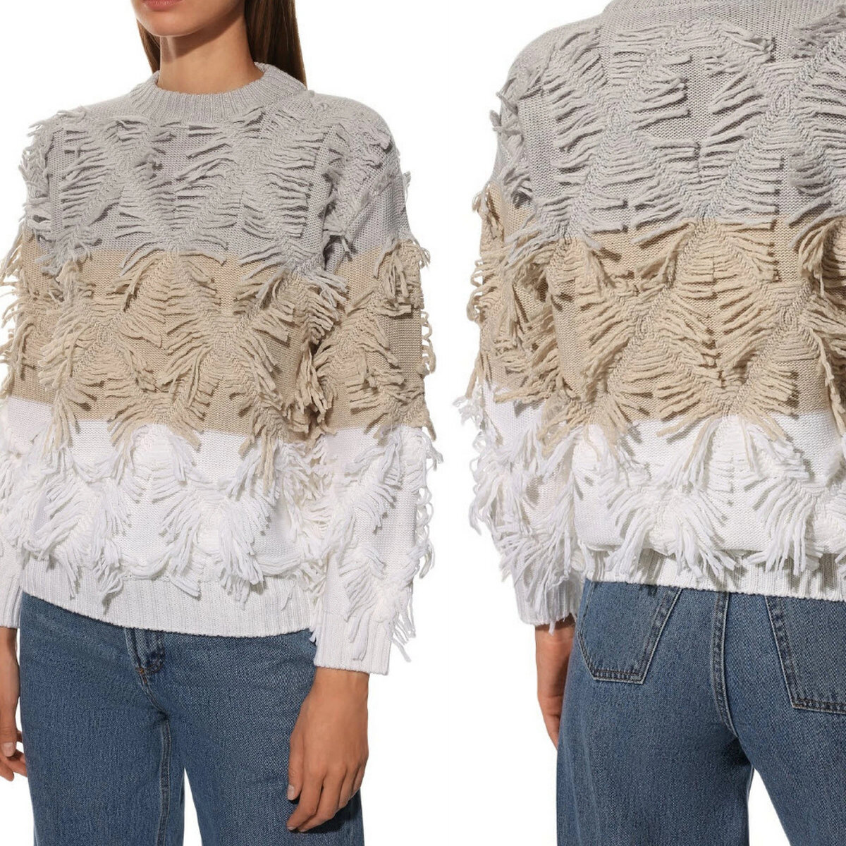 Такая классная модель и вроде бы даже ничего сложного: я вижу здесь несколько простых переходов цвета — самый обычный колор блок из полос; основной узор — изнаночная гладь; ромбовидные перекрещивания из английской резинки; и бахрома.