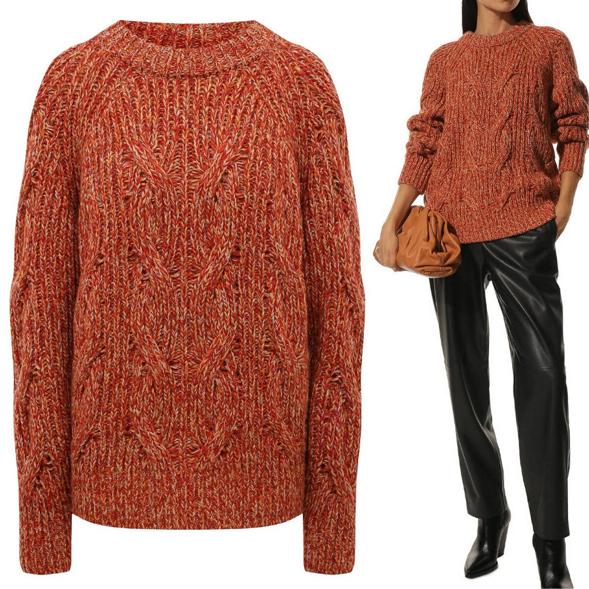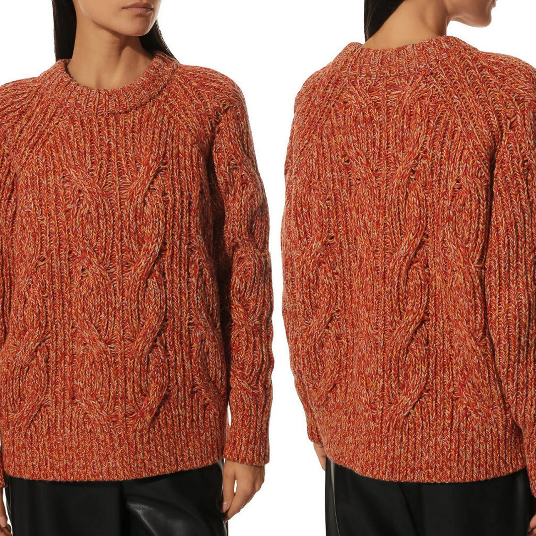 По сути тут обычная резинка 1х1 и жгуты 3х3. Берёте пряжу потолще, вяжете посвободнее и свитер готов! Если сложно найти похожий меланж, можно запросто создать его самостоятельно: делаете микс из трёх цветов — жёлтого, кирпично-красного и молочно-белого — и вяжете в три нити. Можно какие угодно создавать миксы, во сколько угодно нитей (если брать бобинную, то здесь вообще простор для фантазии — видела, рукодельницы такие цветовые сочетания делают, используя до 10 нитей!).