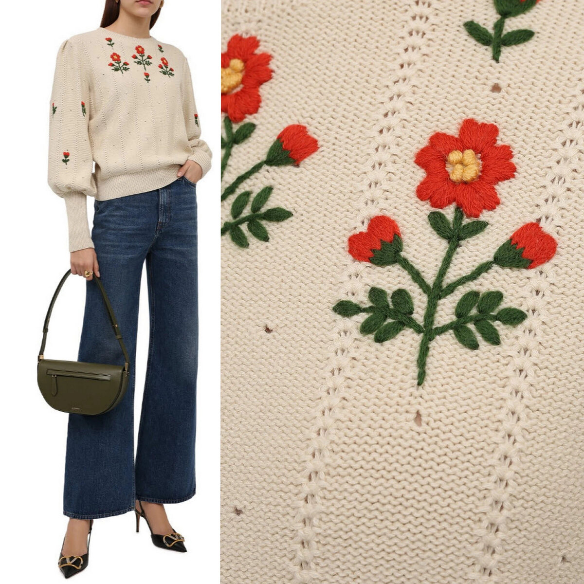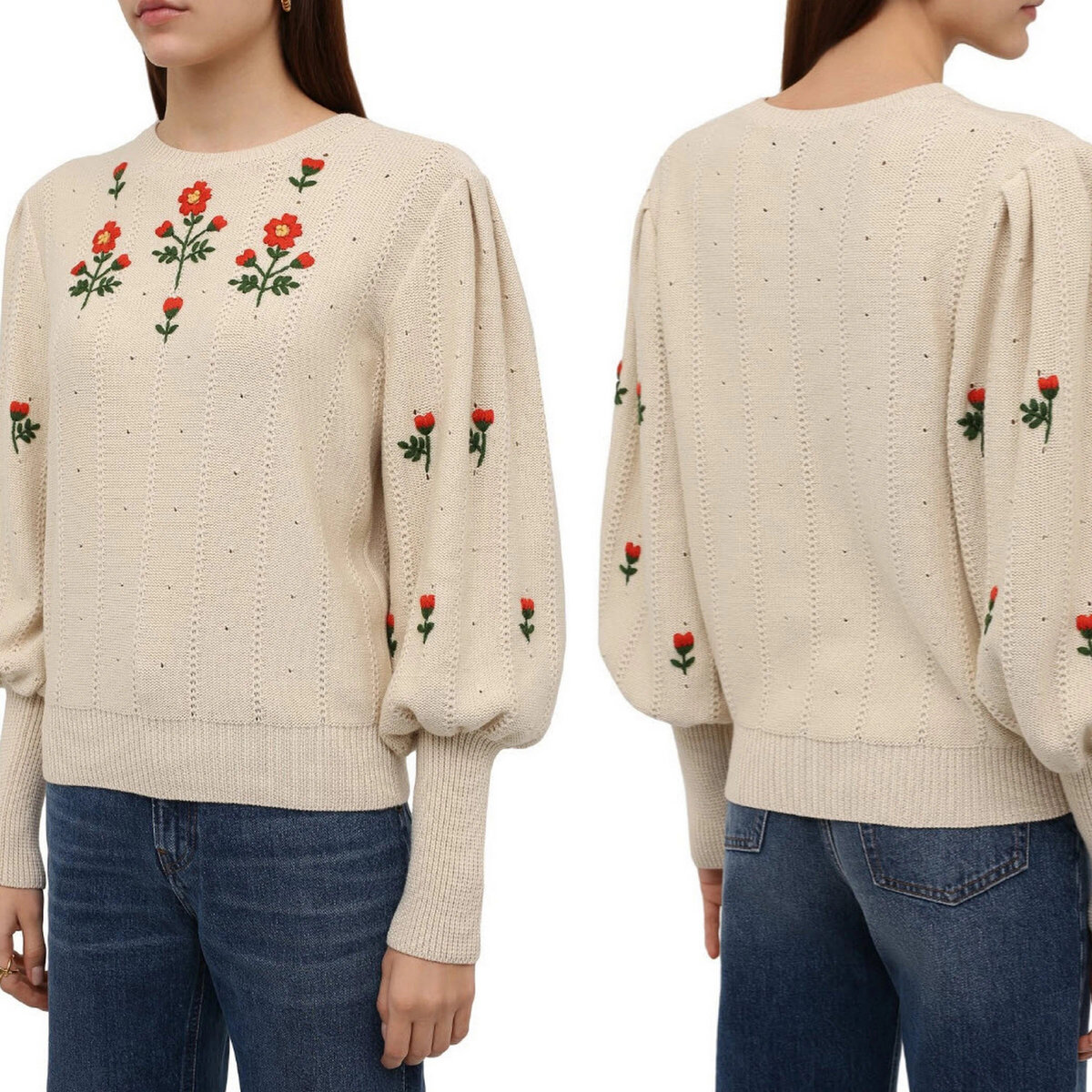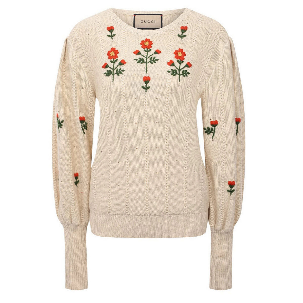 А вот информация о самом джемпере, найденная на сайте ЦУМа: молочно-белый джемпер из осенне-зимней коллекции получился особенно женственным и романтичным. Таким его делают объемные рукава в викторианском стиле и цветочная вышивка, выполненная мастерами марки, основанной Гуччио Гуччи, вручную. Для изготовления модели использовали мягкую пряжу, тонкая шерсть в составе которой отвечает за оптимальную температуру, а нежный хлопок — за циркуляцию воздуха.