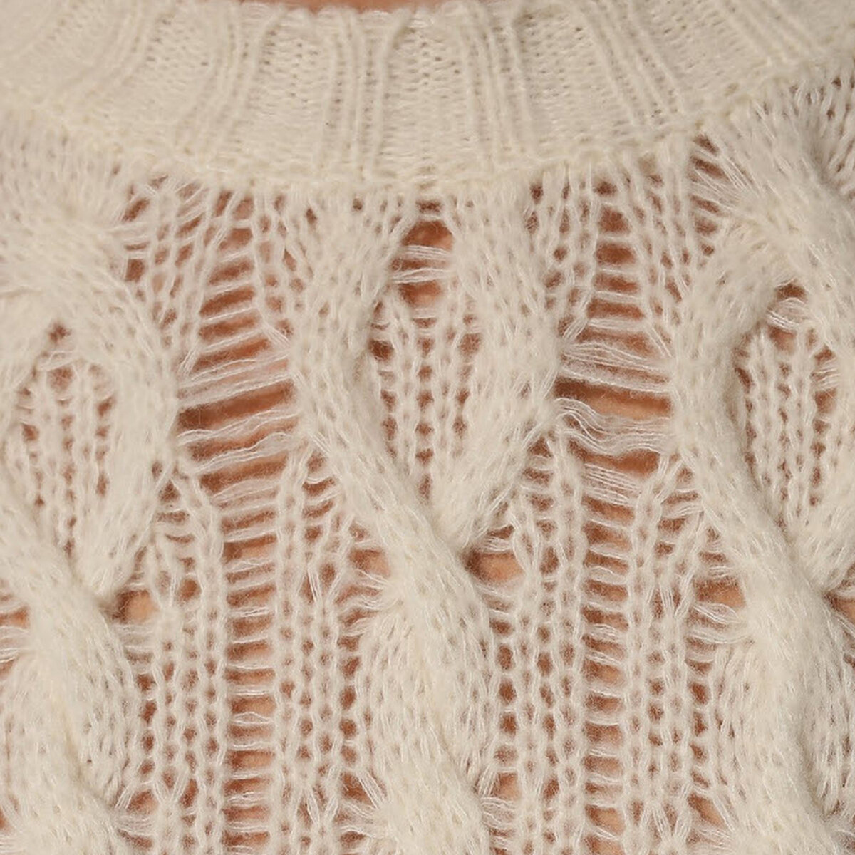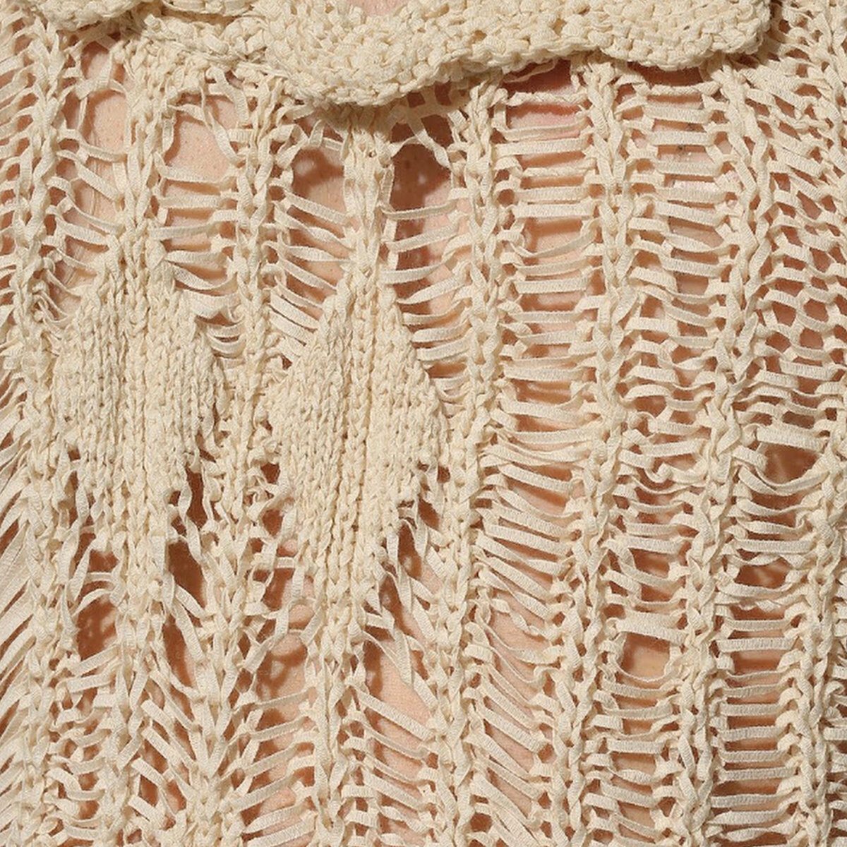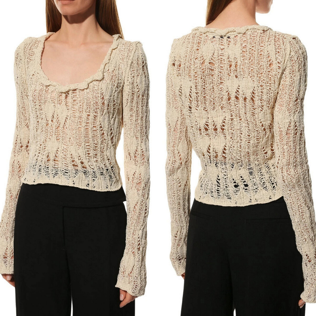 Мастера марки связали ажурный кремовый пуловер из узких шелковистых лент, сформировав хаотичный узор в виде ромбов и полос. Эффект небрежно выполненной вещи поддерживают глубокий круглый вырез, подчеркнутый узкой оборкой с неровными краями, и обработанные с лицевой стороны швы вдоль пройм. Можно взять за основу ромбовидный ажур с частыми накидами (в каждом ряду) и спущенные петли.
