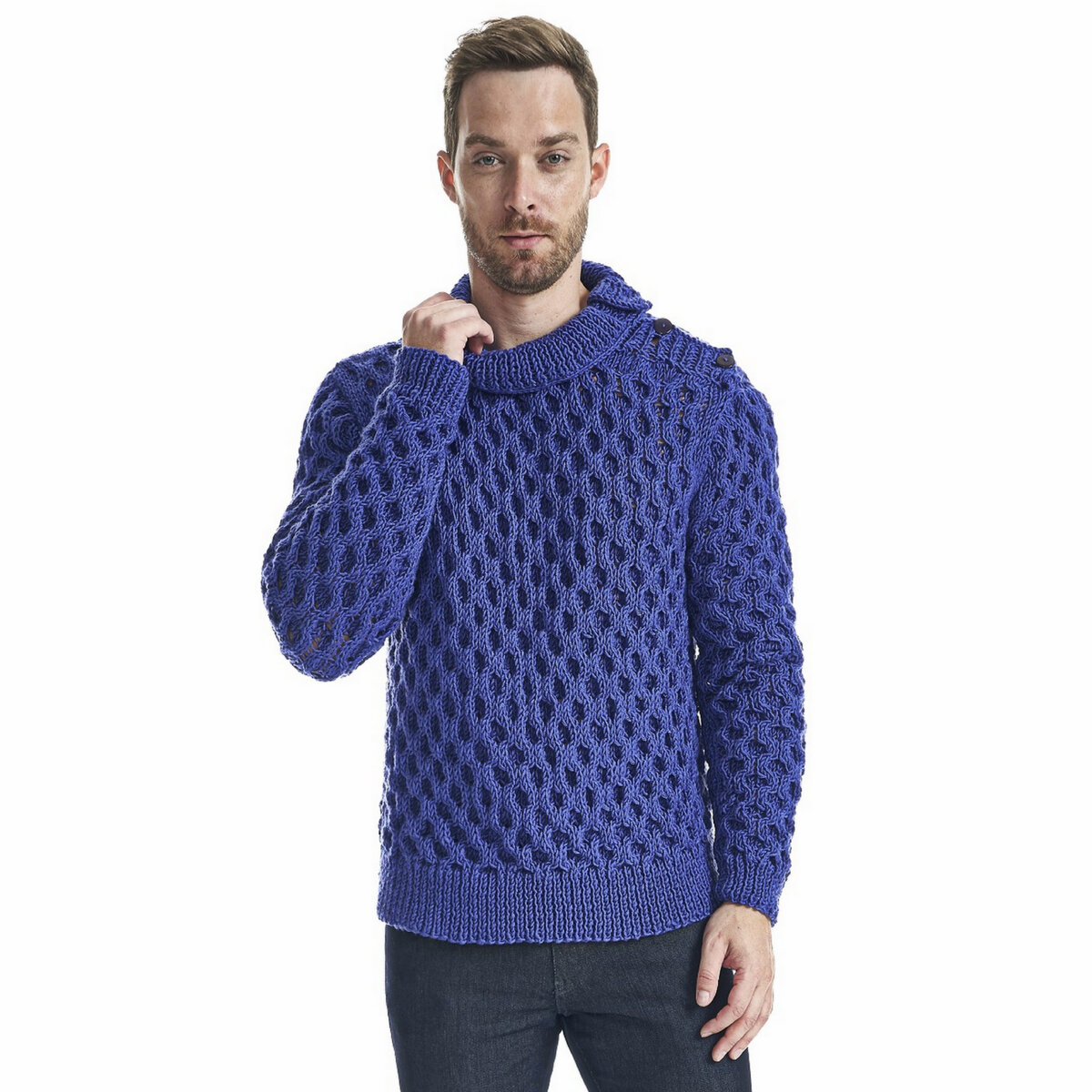 Васильковый свитер с объёмным узором из крупных сот и интересным отложным воротом на пуговицах. Прямой фасон чуть ниже пояса, втачной рукав и ворот, застёгивающийся на одну сторону по плечу.