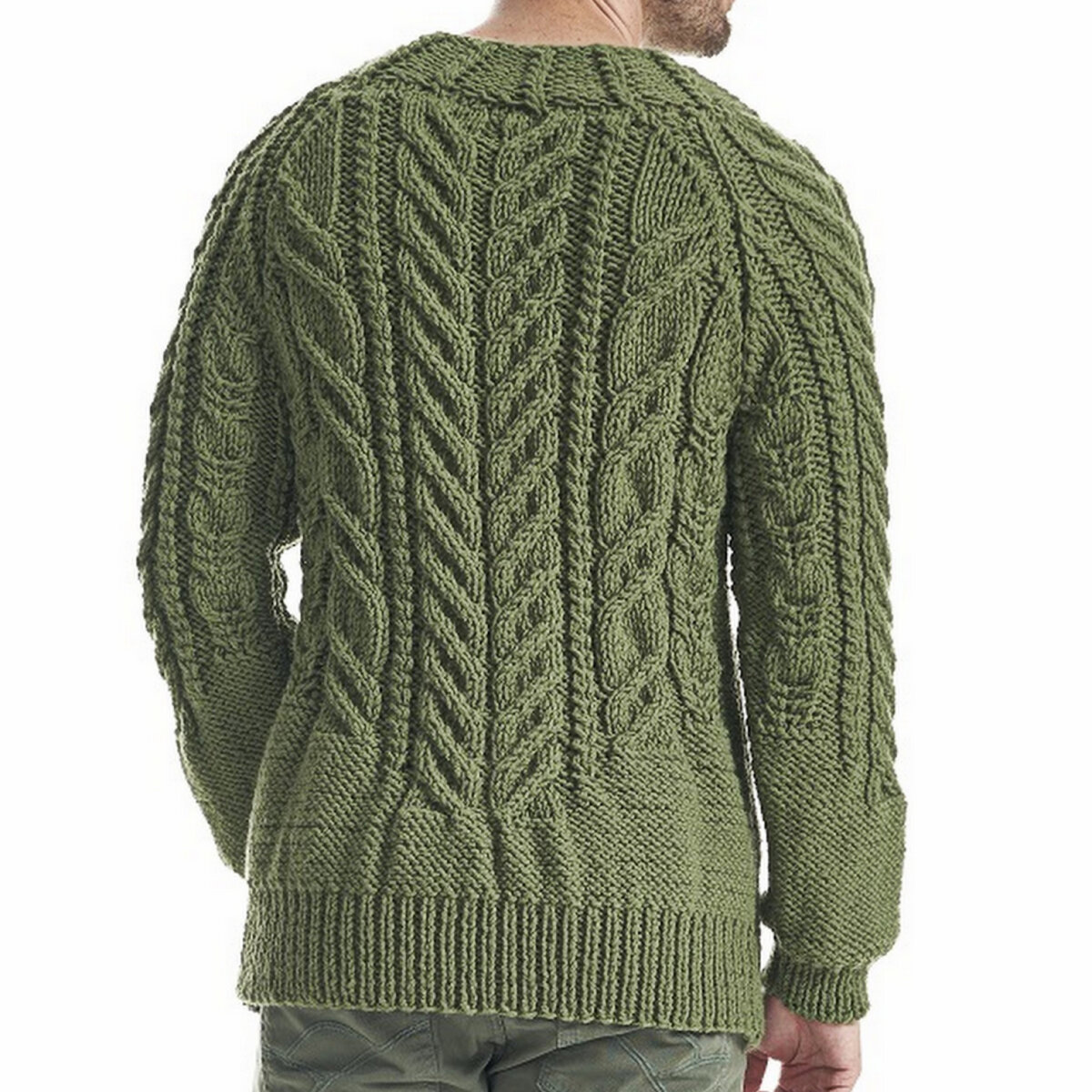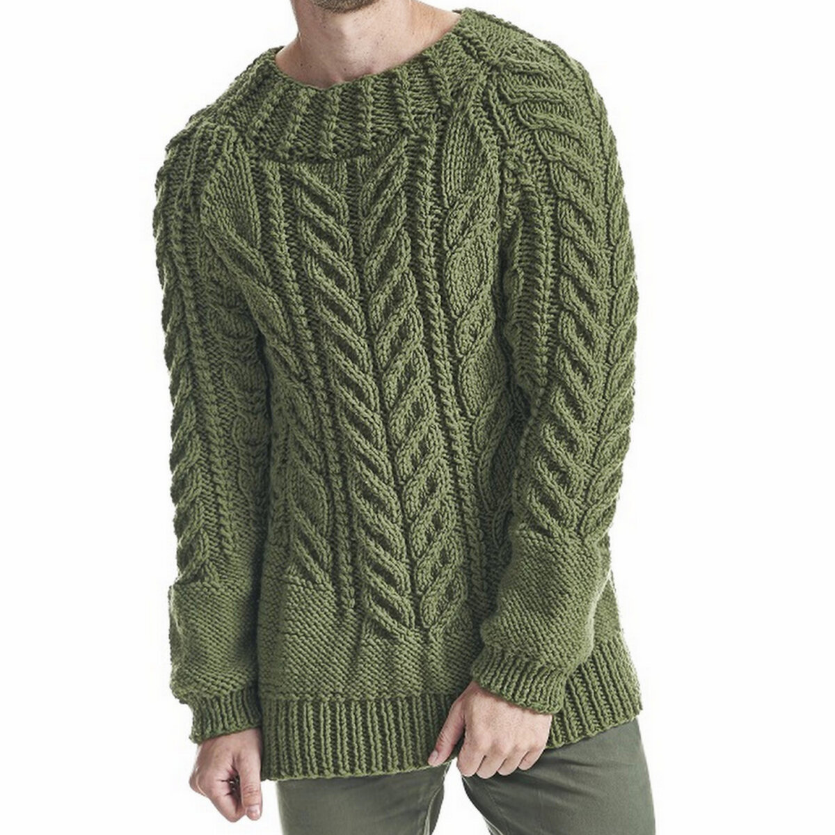 Удлинённый свитер цвета хаки с разнообразием объёмных и рельефных узоров. От такого свитерочка я б и сама не отказалась! Отличная унисекс модель. Прямой фасон до бедер, рукава-реглан и широкий круглый вырез горловины.
