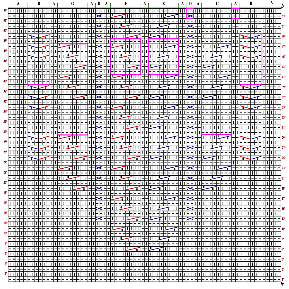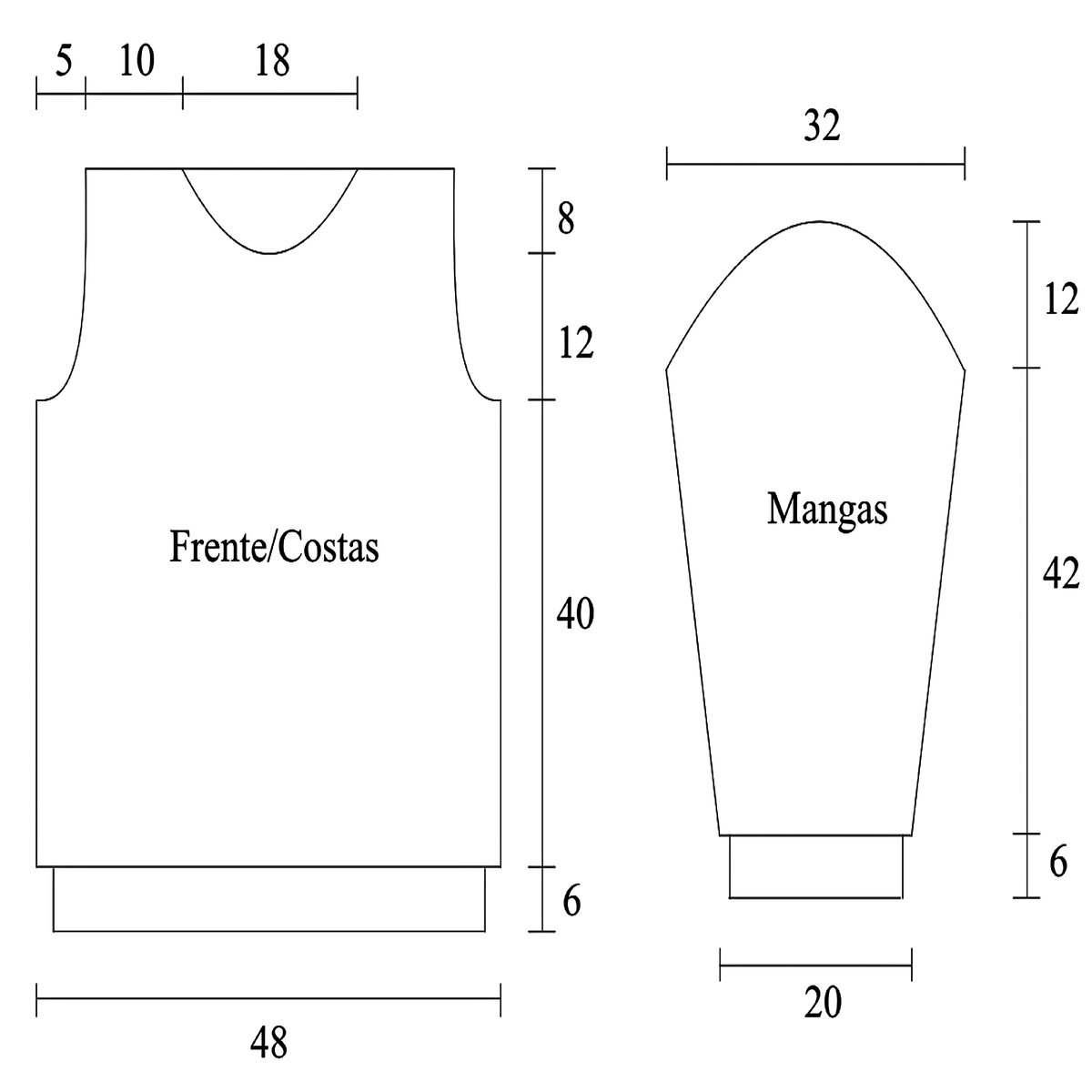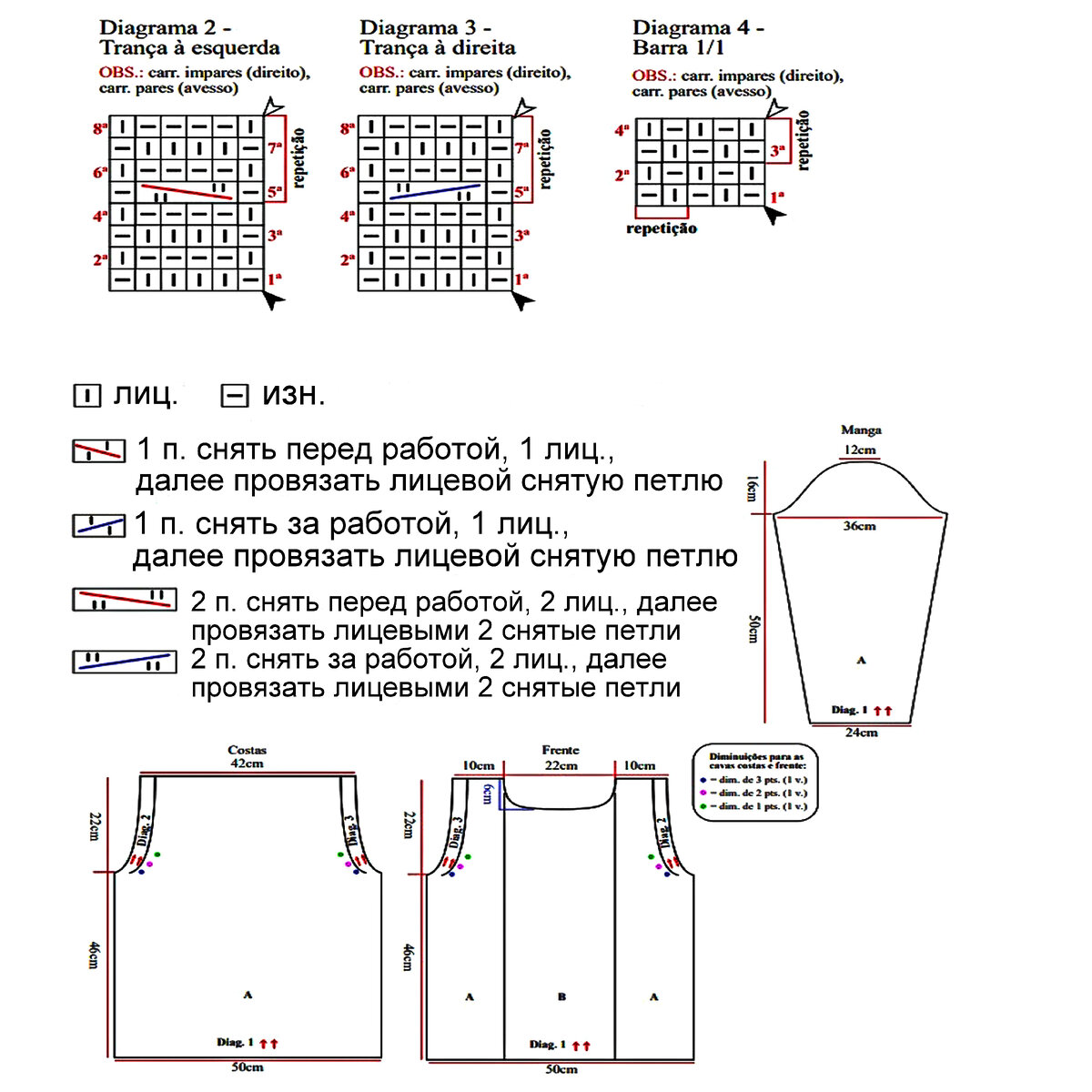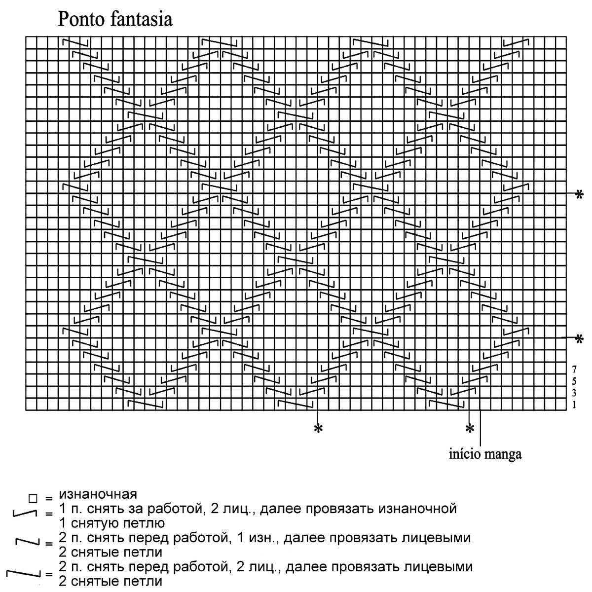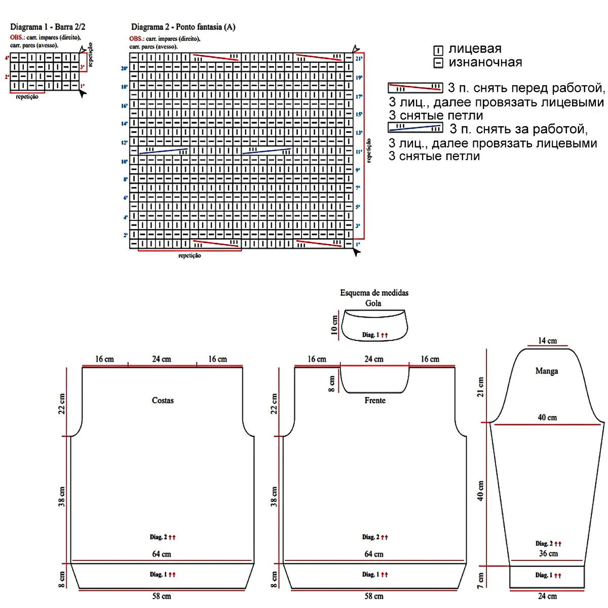 Серый свитер-резинка с рельефным узором из ромбов по середине и оригинальной окантовкой оката рукава в виде объёмных кос. Прямой фасон чуть ниже пояса, втачной рукав и круглый вырез горловины и двойной ворот.