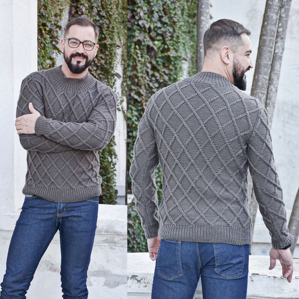 Серо-коричневый свитер с рельефными ромбами на изнаночном фоне. Стильный вариант для мужчин с хорошей фигурой! Прямой фасон чуть ниже пояса, узкий втачной рукав и глубокий круглый вырез горловины.