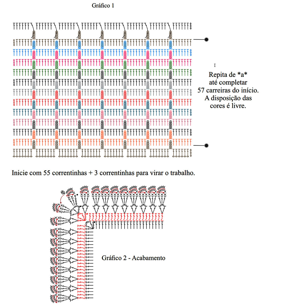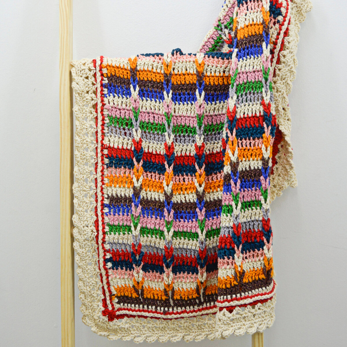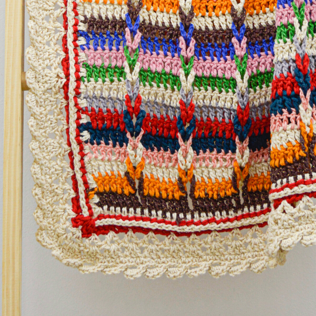 Простой и яркий плед из столбиков с накидом и воздушных цепочек, складывающихся в большие косички. Отличный способ пристроить остатки разноцветной пряжи!