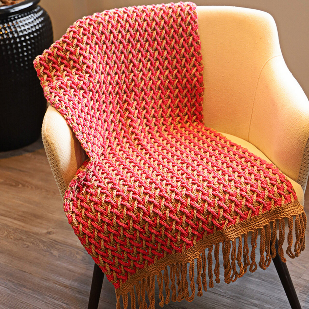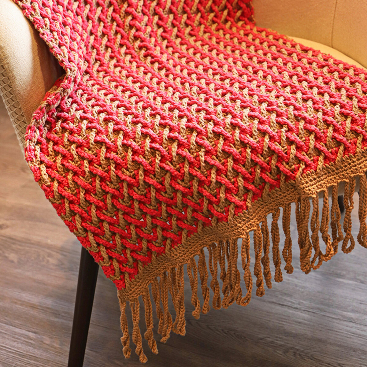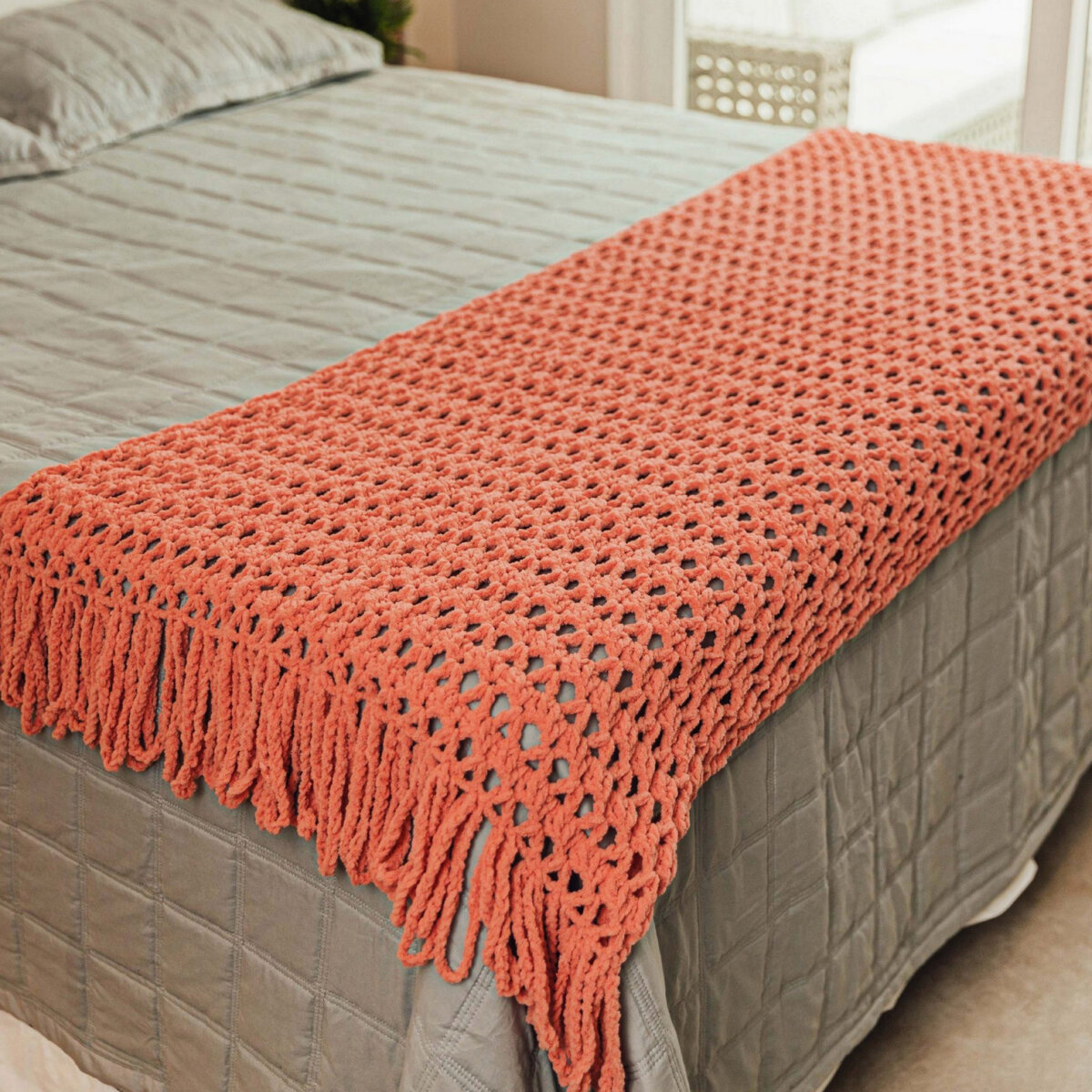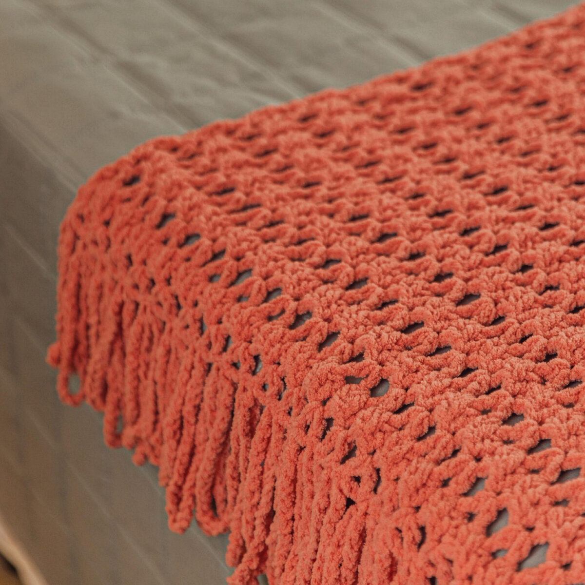 Узкий коралловый плед с крупным сетчатым узором, украшенный оригинальной бахромой из воздушных цепочек. Мягкий и воздушный, с бархатистой текстурой — связан из плюшевой пряжи.