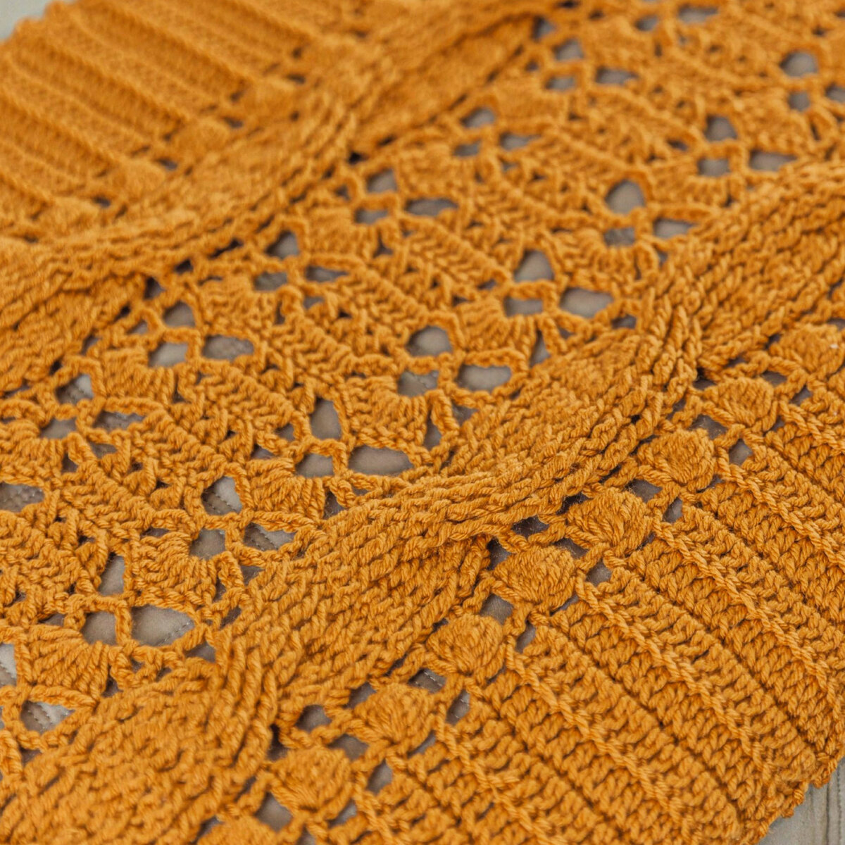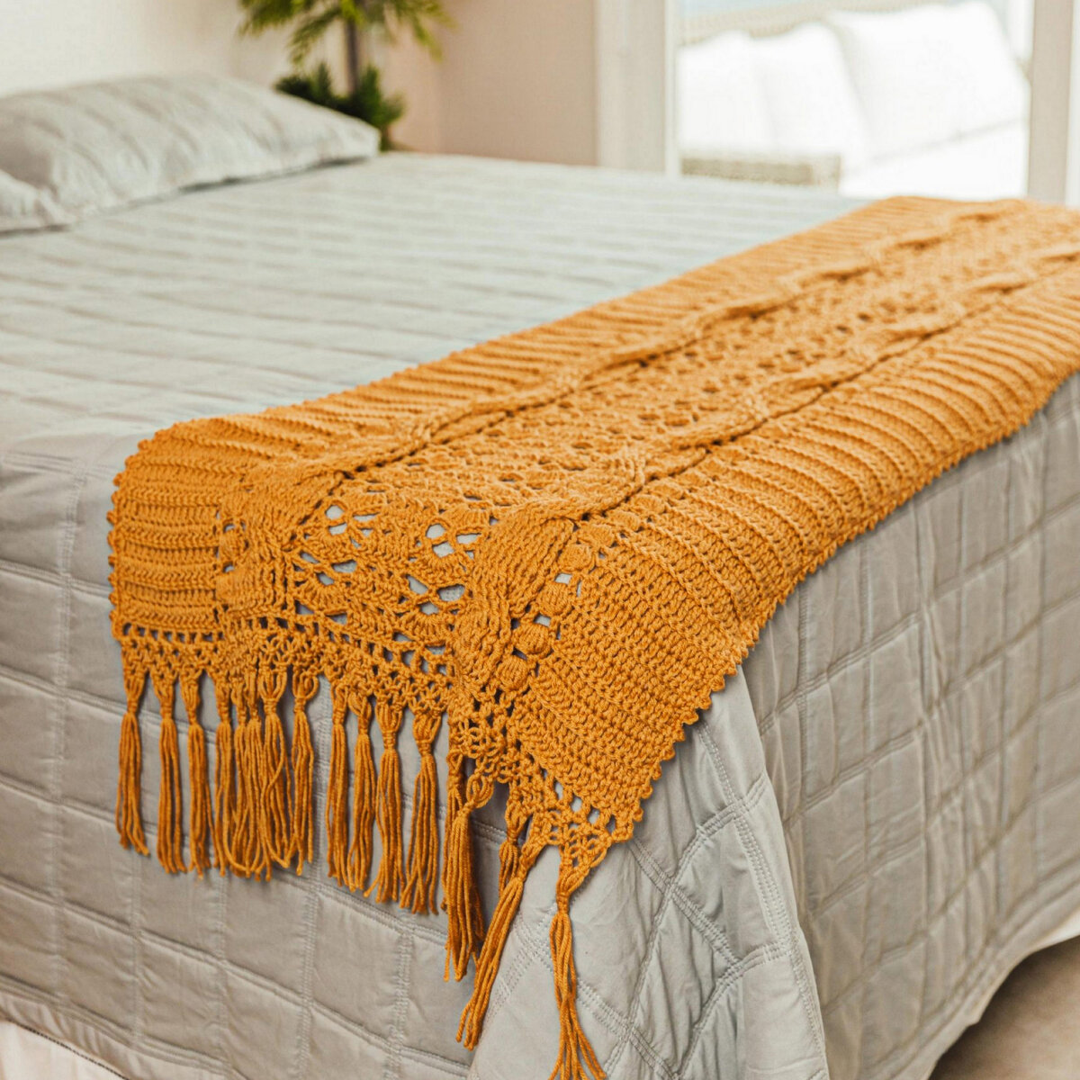 Узкий горчичный плед с рельефными косами и ажуром, украшенный бахромой с элементами макраме. Стильная интерьерная вещичка!