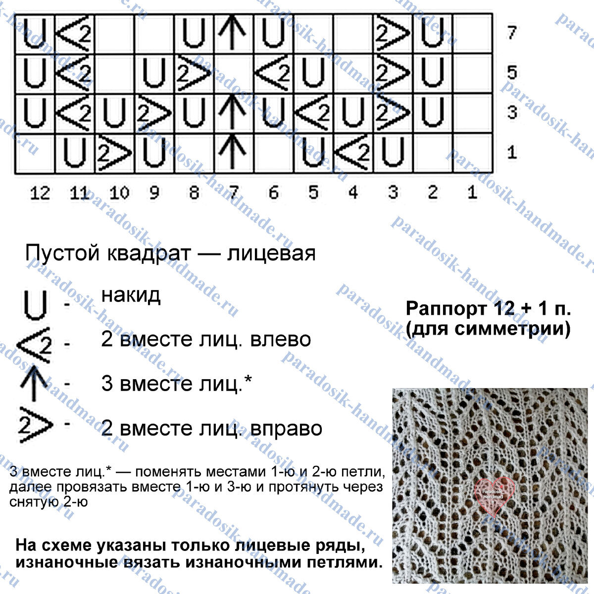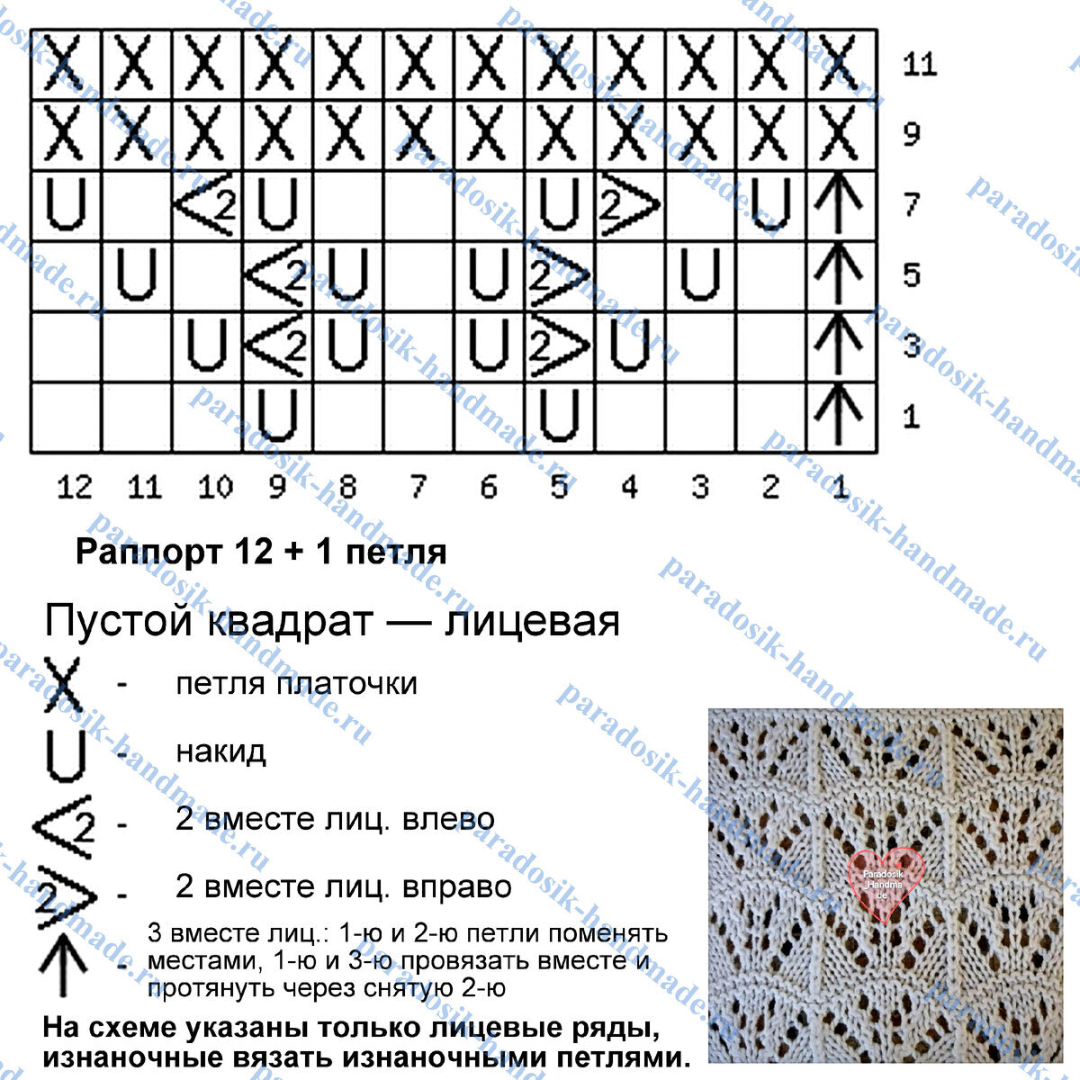 Раппорт узора 12 петель и 12 рядов в высоту. На схеме указаны только лицевые (нечётные) ряды, изнаночные (чётные) вязать изнаночными петлями.