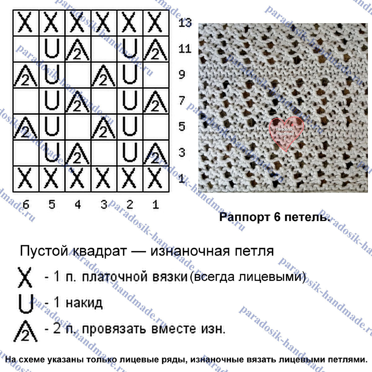 Раппорт узора 6 петель и всего 14 рядов в высоту. На схеме указаны только лицевые (нечётные) ряды, изнаночные (чётные) вязать лицевыми петлями, в том числе и накиды.