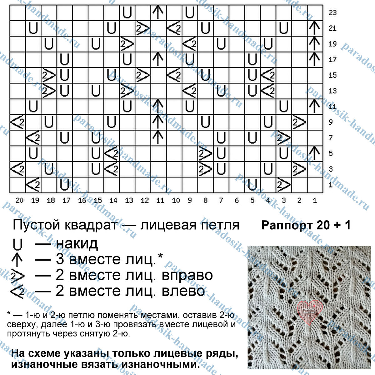 Раппорт узора 20 петель и 24 ряда в высоту. На схеме указаны только лицевые (нечётные) ряды, изнаночные (чётные) вязать изнаночными петлями.