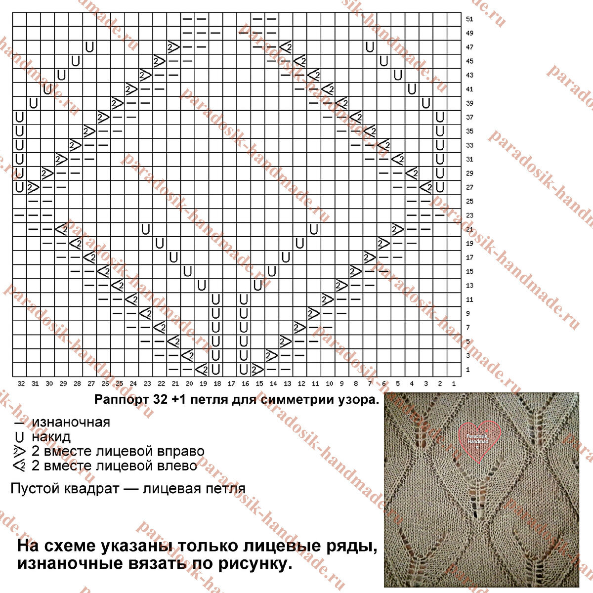 Раппорт узора 32 петли и 52 ряда в высоту. На схеме указаны только лицевые (нечётные) ряды, изнаночные (чётные) вязать по рисунку. Для поворотного вязания необходимо будет добавить ещё одну петлю к общему количеству раппортов — для красивой симметрии узора.