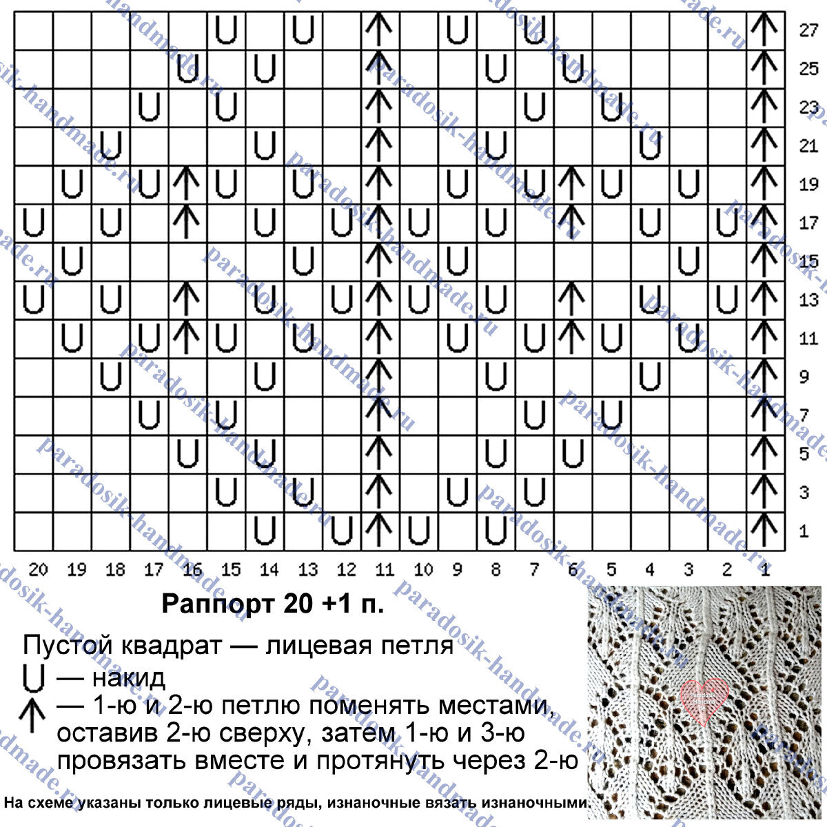 Раппорт узора 20 петель и 28 рядов в высоту. На схеме указаны только лицевые (нечётные) ряды, изнаночные (чётные) вязать изнаночными петлями.