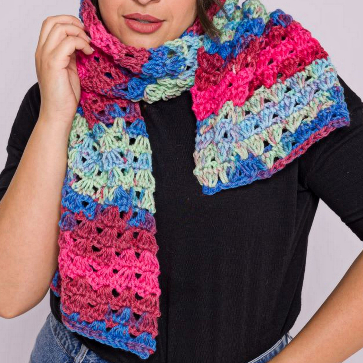 Для вязания нам потребуется 2 мотка радужной секционной пряжи: 50% хлопок, 50% акрил; 100 гр — 200 м. Крючок № 4.