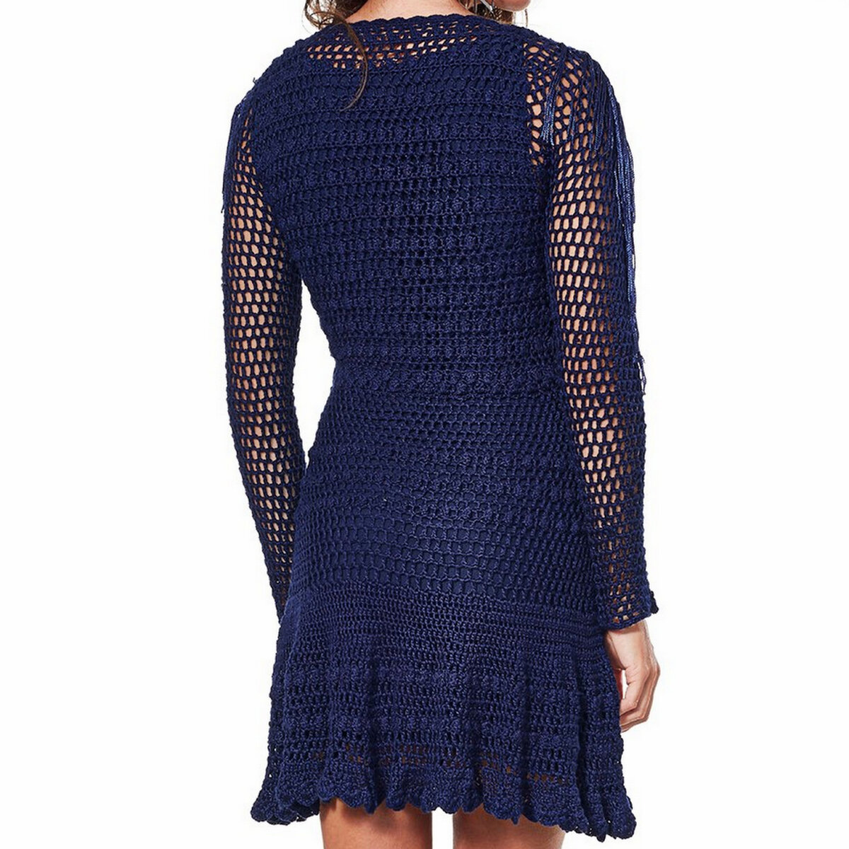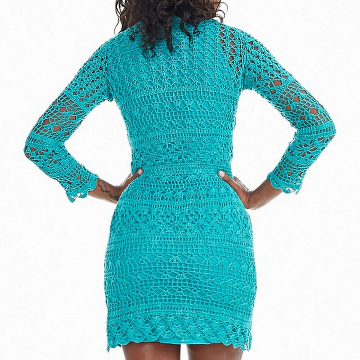 Прелестное бирюзовое мини с разнообразием красивых ажурных узоров. Облегающий силуэт выше колена, длинные узкие рукава и круглый вырез горловины.