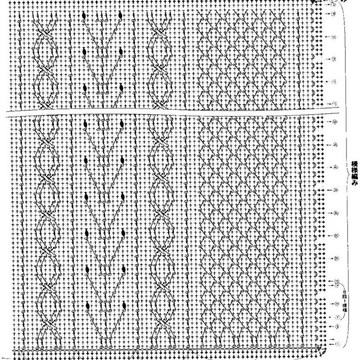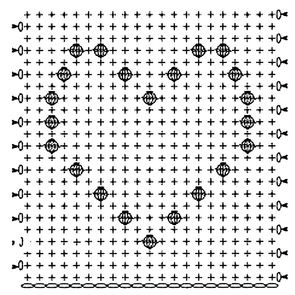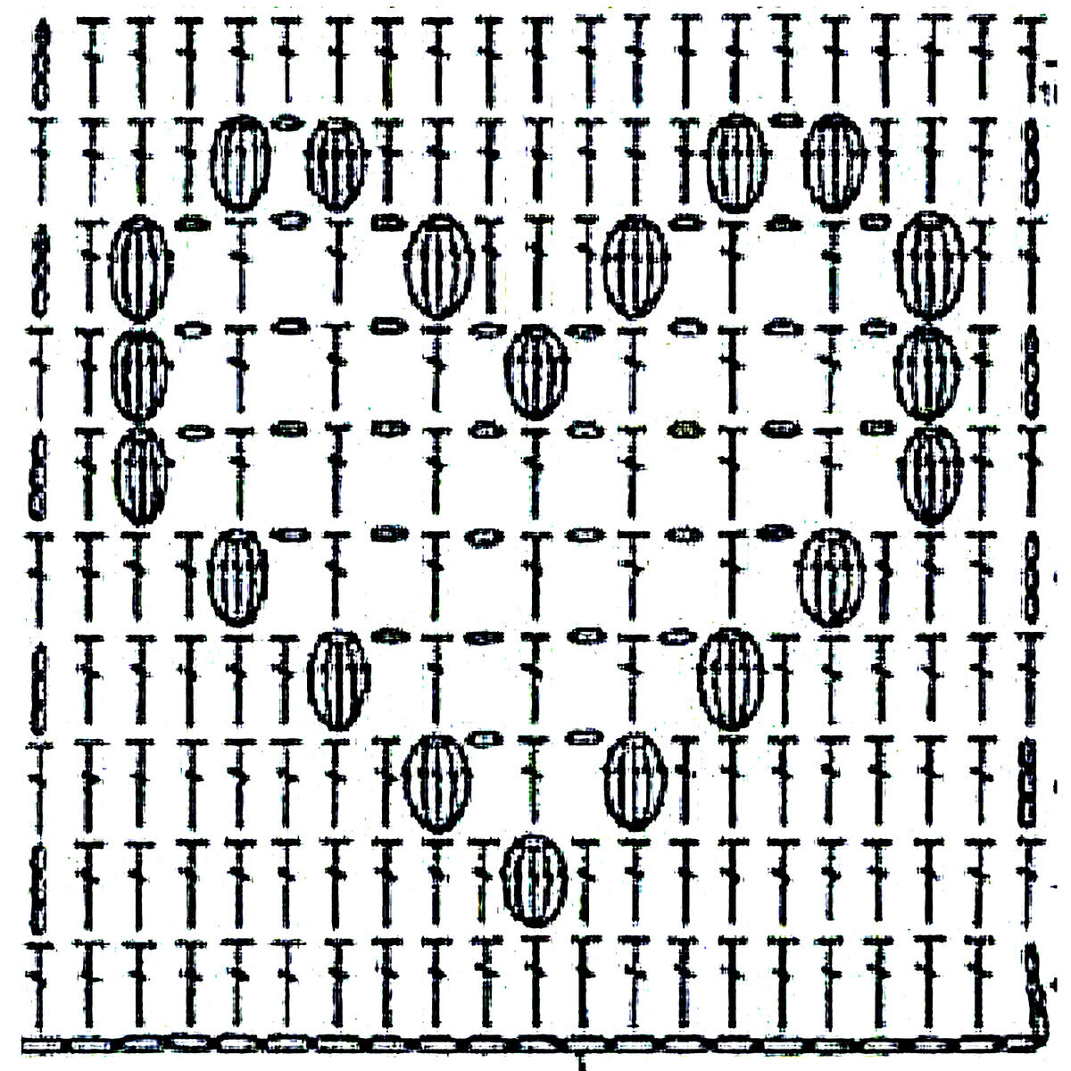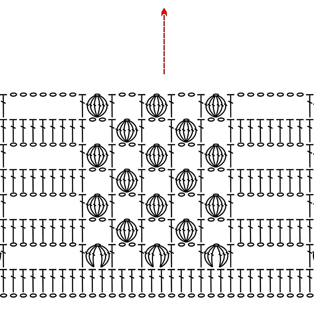 Подобрала похожую схему узора, с той только разницей, что на схеме представлен «попкорн», а не «пышный столбик». На самом деле, разница между этими узорами не велика и заключается, в основном, в способе провязывания «шишечки».