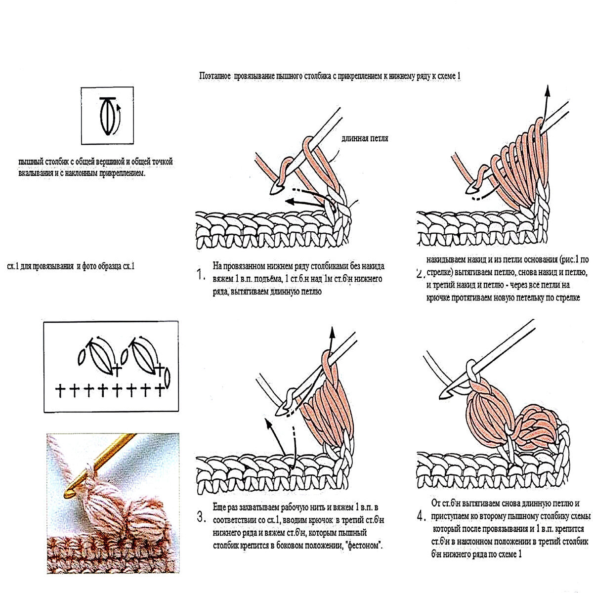 Схема вязания «пышного столбика» крючком.