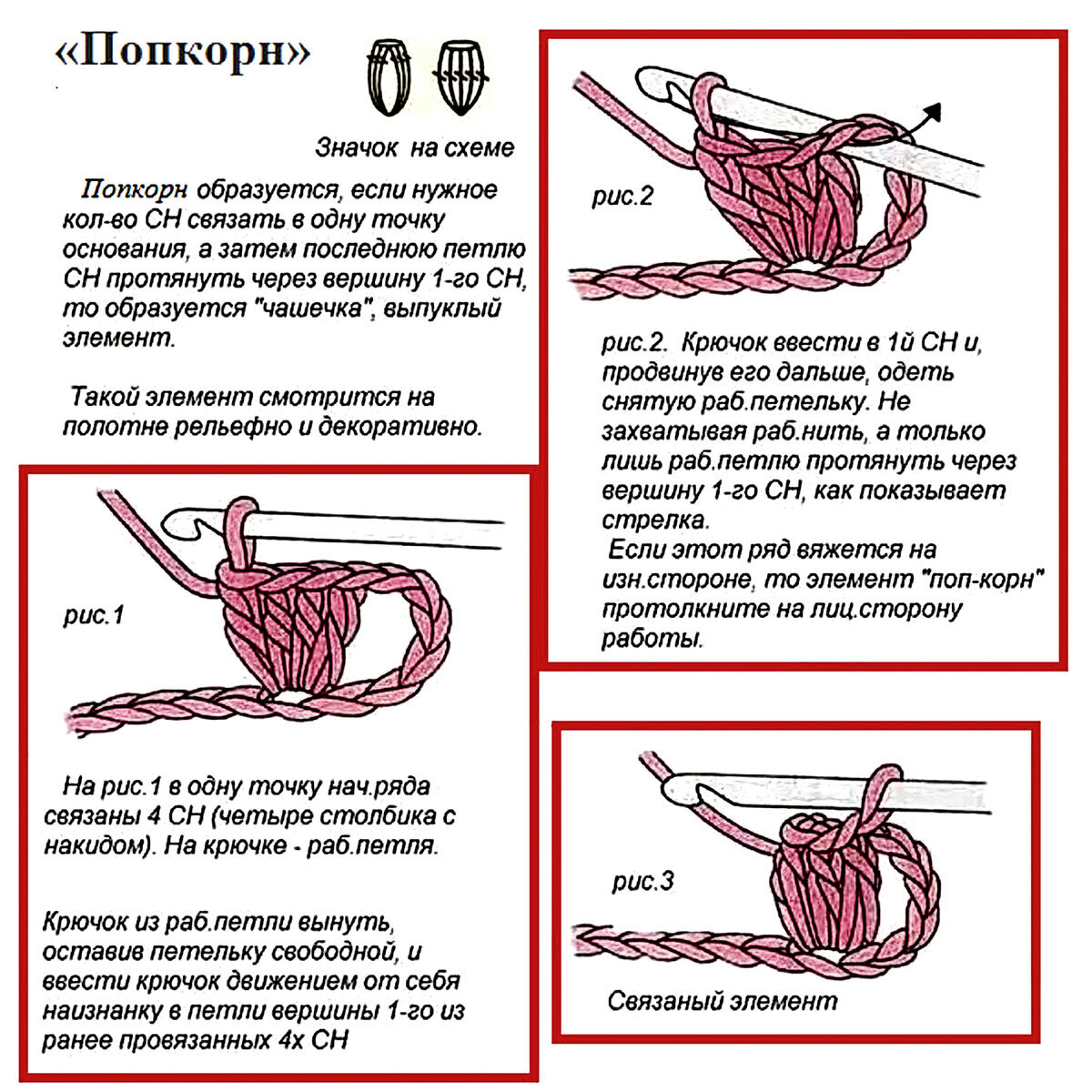 Схема вязания «попкорна» крючком.