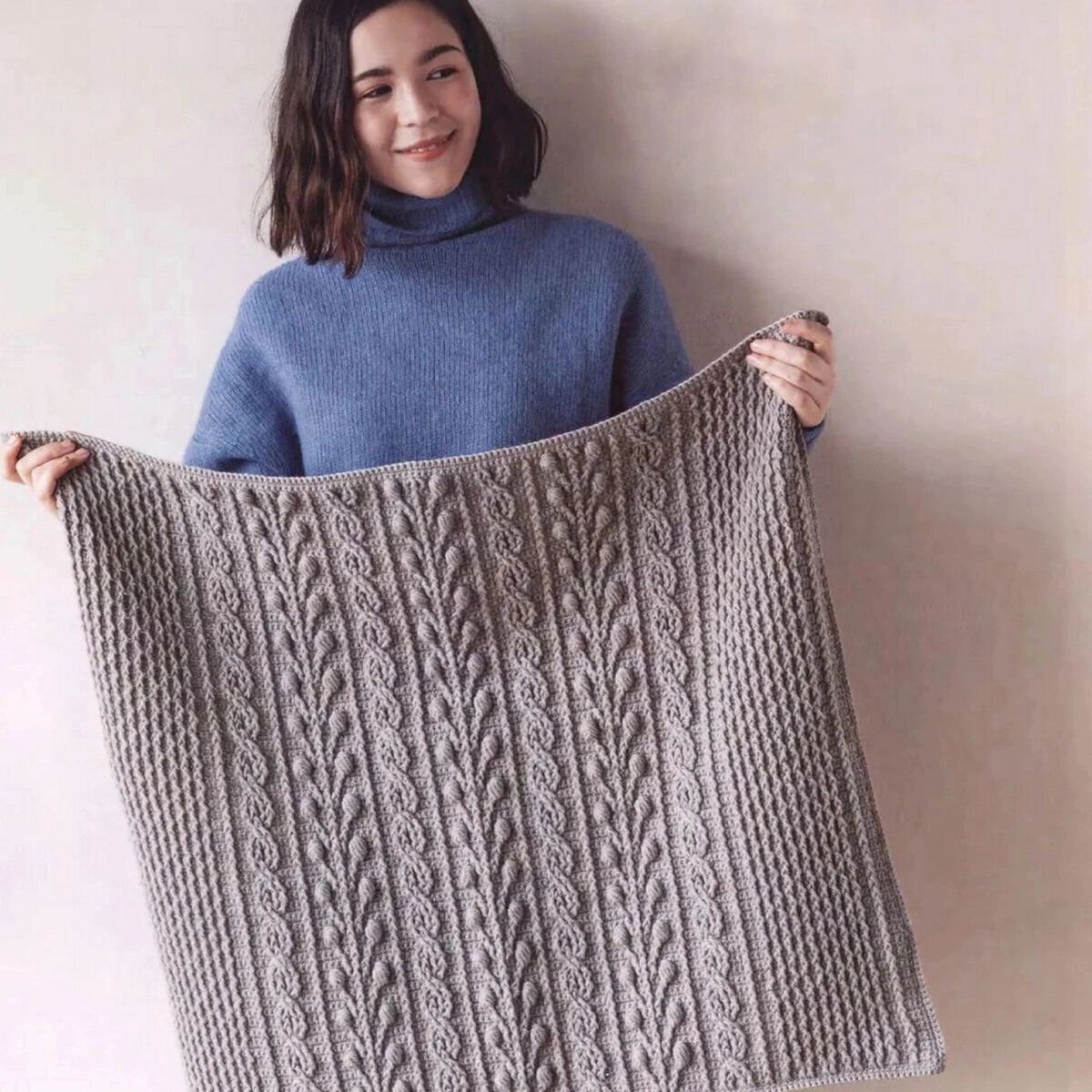 Для такого объёмного узора лучше выбирать мягкую и лёгкую пряжу (то бишь, с содержанием акрила желательно) — шерсть с акрилом, хлопок с акрил, микрофибра или даже 100% детский акрил. Зависит от того, для какого сезона вы планируете связать плед и какую функцию он будет выполнять — просто для красоты или всё же для тепла.
