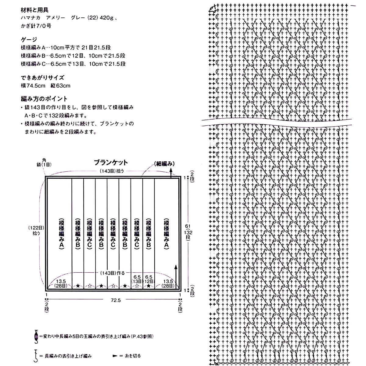 Нашла ещё одну интересную схему с сердечками — здесь вместо обычных столбиков без накида идут столбики с накидами и сетка из них посередине. Такой вариант подойдёт для тех, кто хочет, чтобы плед или покрывало были менее объёмными и тяжёлыми (и, соответственно, уменьшился расход пряжи).