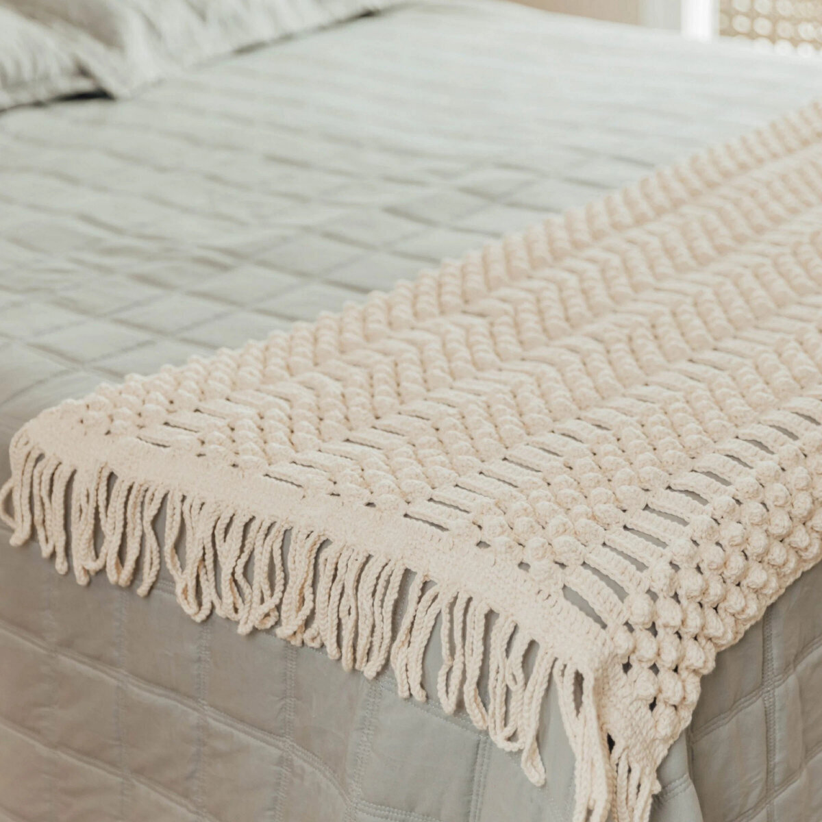 Сначала мне показалось, что покрывало связано спицами. И ведь правда узор похож на спицевые жгуты на изнаночном фоне и узор с шишечками. Но при ближнем рассмотрении стало понятно, что это всё же крючок.
