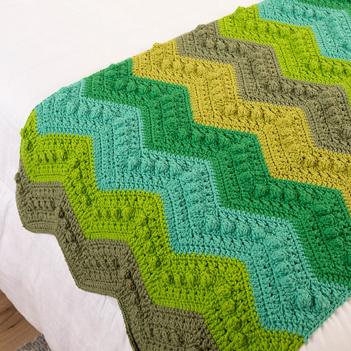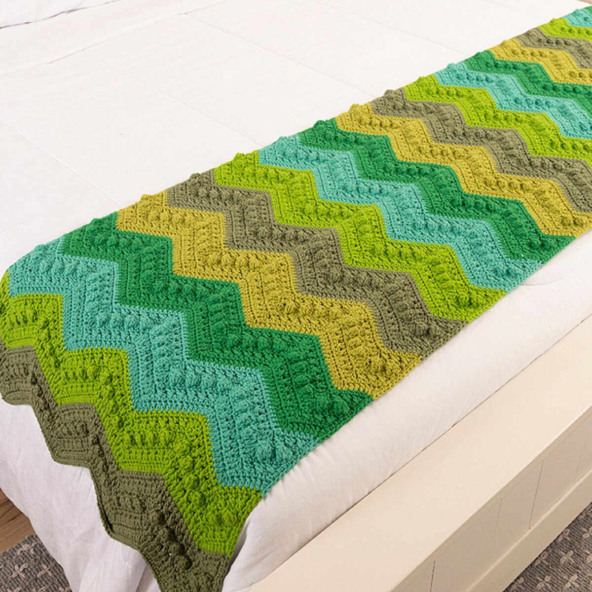 Уютный зелёный плед, связанный роскошным узором «зигзаги». Объём и оригинальность узору придают пышные шишечки. Такая узкая и длинная модель отлично подойдёт в качестве покрывала на кровать, удобного пледа на диван или накидки на большое кресло.