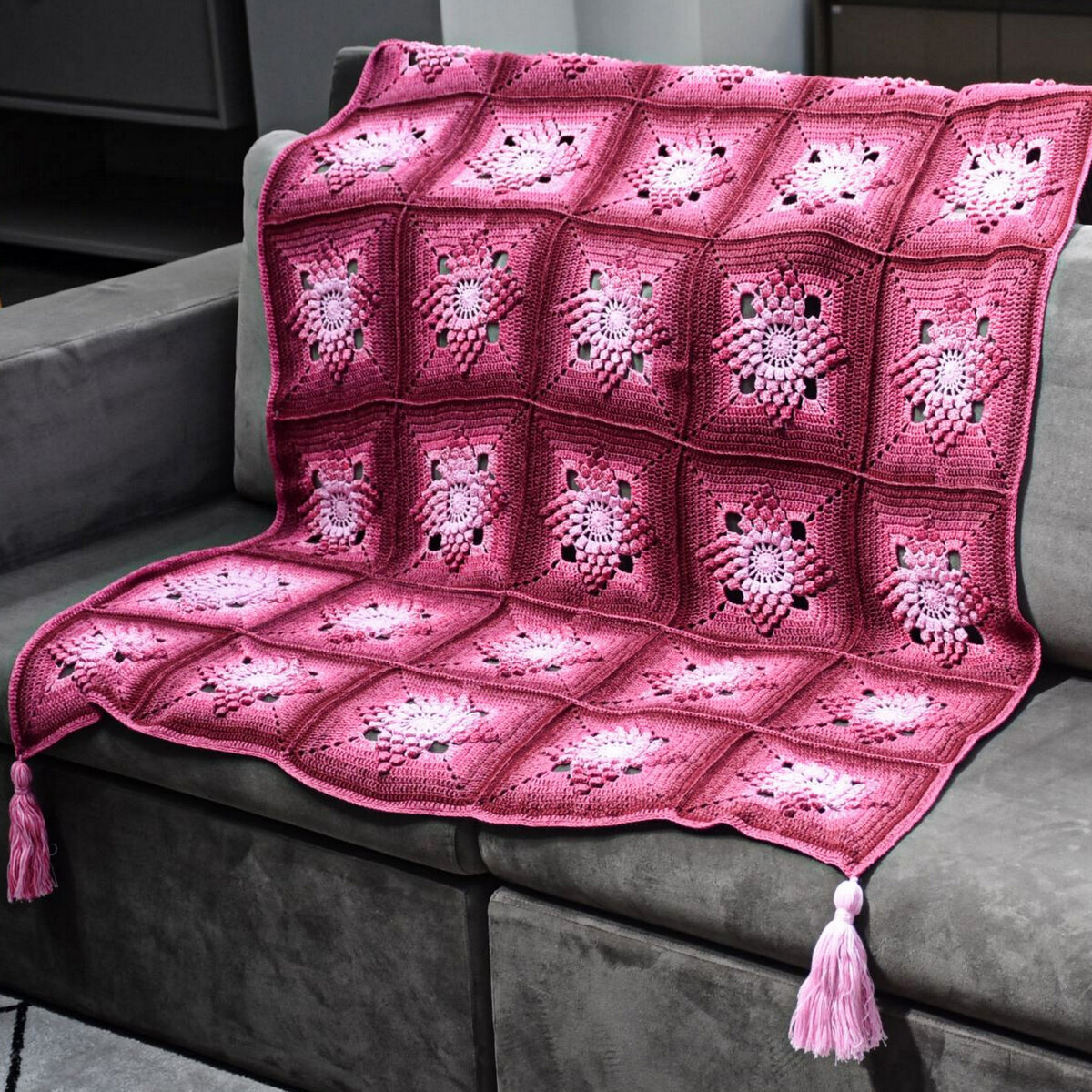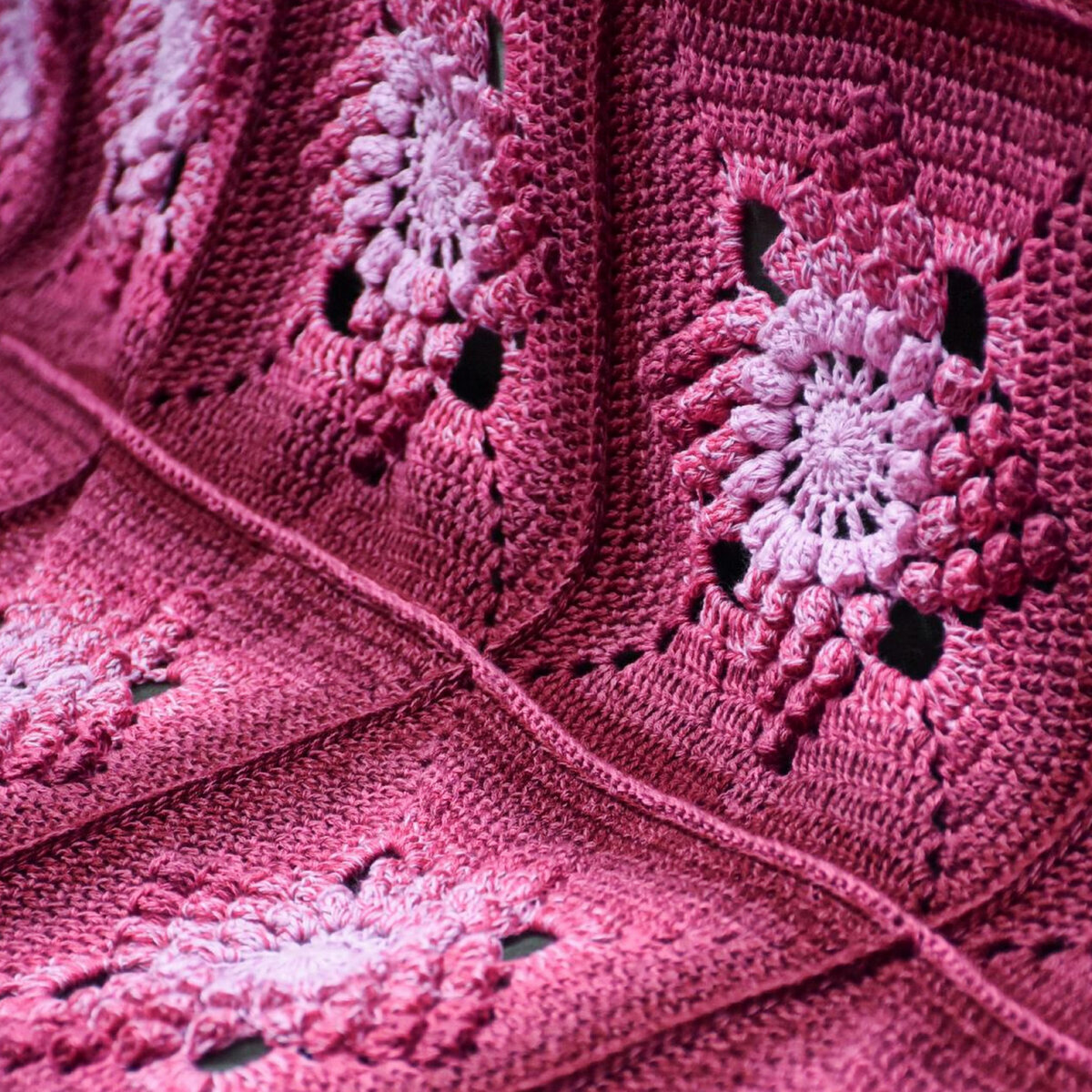 Шикарный малиново-винный плед с нежным градиентным переходом, связанный объёмными квадратными мотивами. Главная сложность данного пледа — подогнать все квадраты по цветовой гамме. Для этого лучше искать пряжу с относительно короткими секциями.