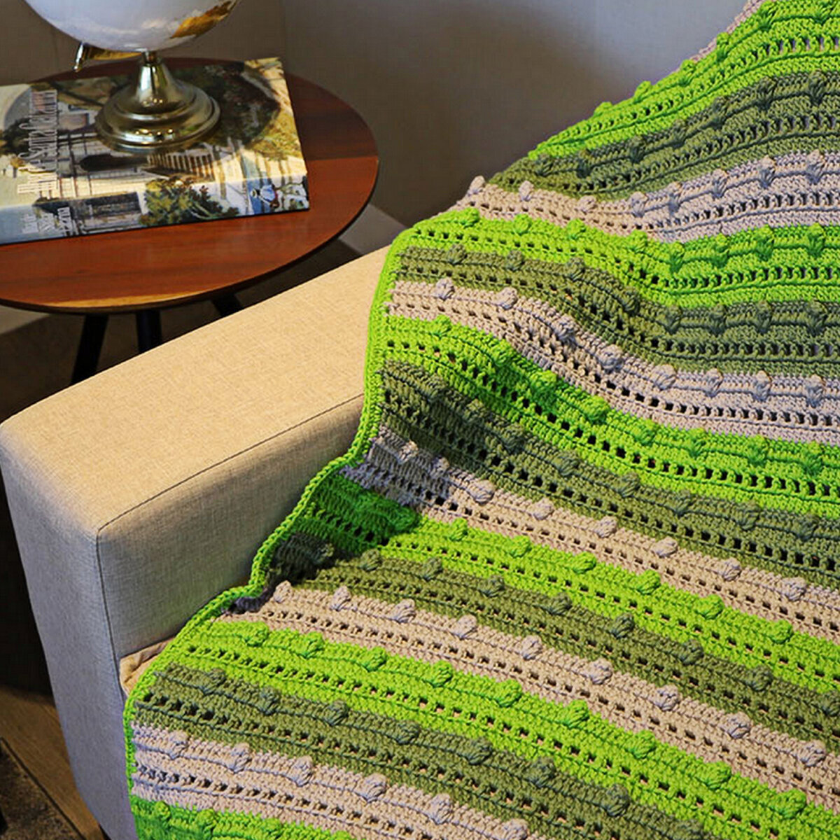 Этот сочный зелёный плед — словно напоминание об ушедшем лете. Яркое и одновременно нежное сочетание салатового, болотно-зелёного и серого оттенков. Серый цвет отлично смягчает мрачность хаки и одновременно уменьшает «вырвиглазность» салатового цвета.