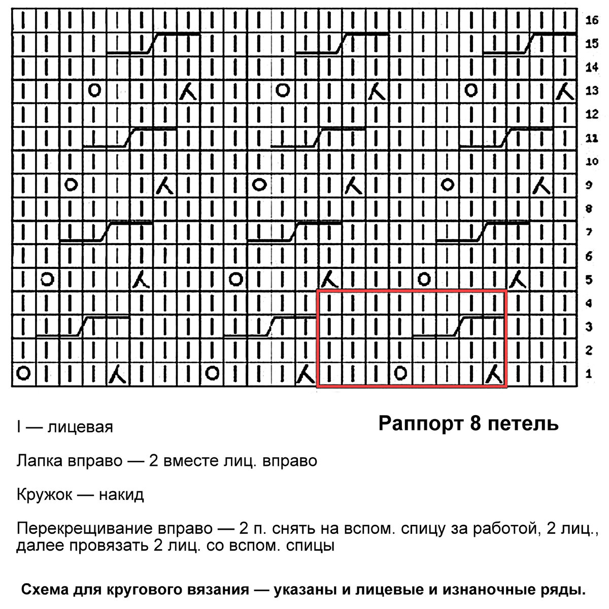 Раппорт узора 26 петель и 24 ряда в высоту. Схема для кругового вязания — указаны и лицевые и изнаночные ряды. При поворотном вязании чётные (изнаночные ряды) нужно будет отзеркаливать: где на схеме указана лицевая петля, вязать изнаночной, где 2 вместе лицевой право — 2 вместе изнаночной влево, где 2 вместе лиц. влево — 2 вместе изн. вправо и так далее.