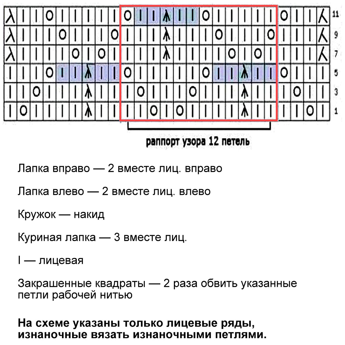 Раппорт узора 12 петель и 12 рядов в высоту. На схеме указаны только лицевые (нечётные) ряды, изнаночные (чётные) вяжем изнаночными петлями.