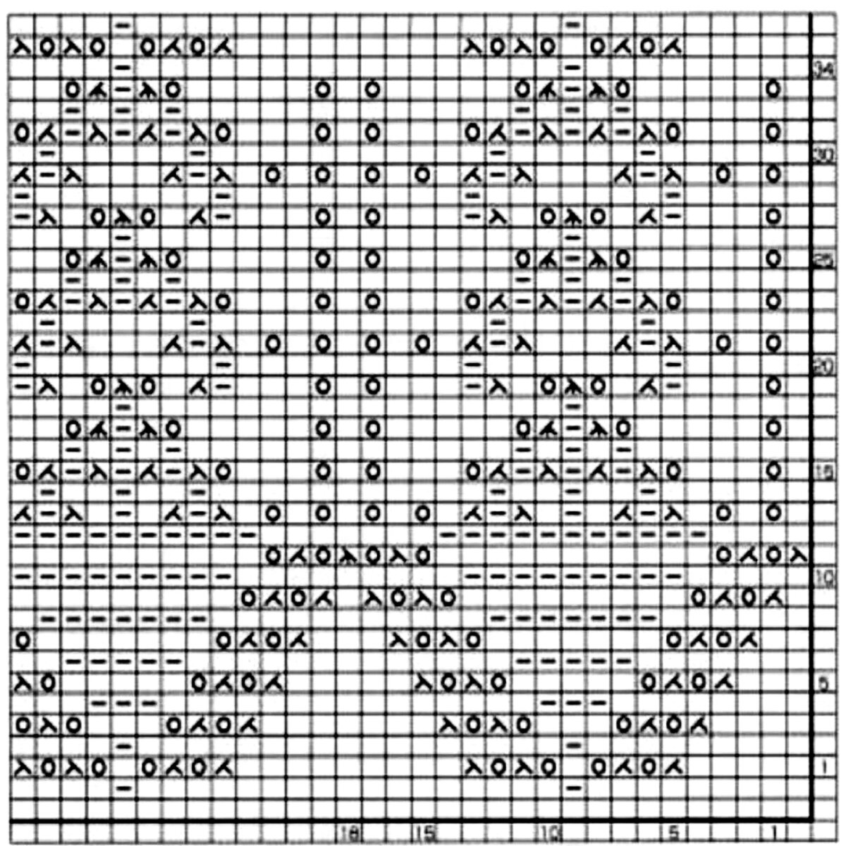 Раппорт узора 18 петель и 34 ряда в высоту. На схеме указаны и лицевые и изнаночные ряды.