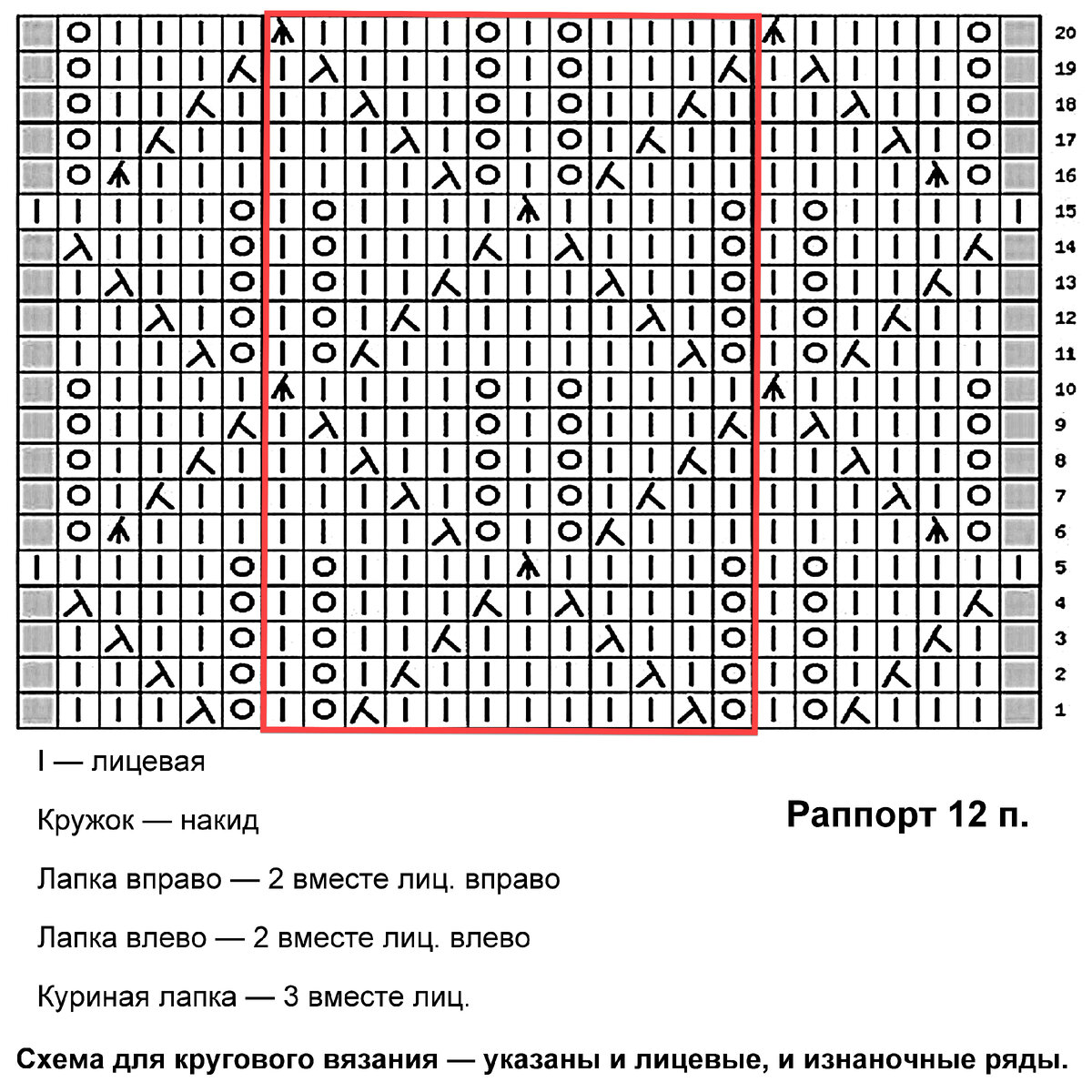 Раппорт узора всего 12 петель и 20 рядов в высоту. Обратите внимание, что схема для кругового вязания — указаны и лицевые, и изнаночные ряды! При вязании поворотными рядами рекомендуется добавить ещё 1 петлю к общему количеству и начинать вязание петлями, указанными до раппорта, заканчивая петлями после раппорта на схеме.