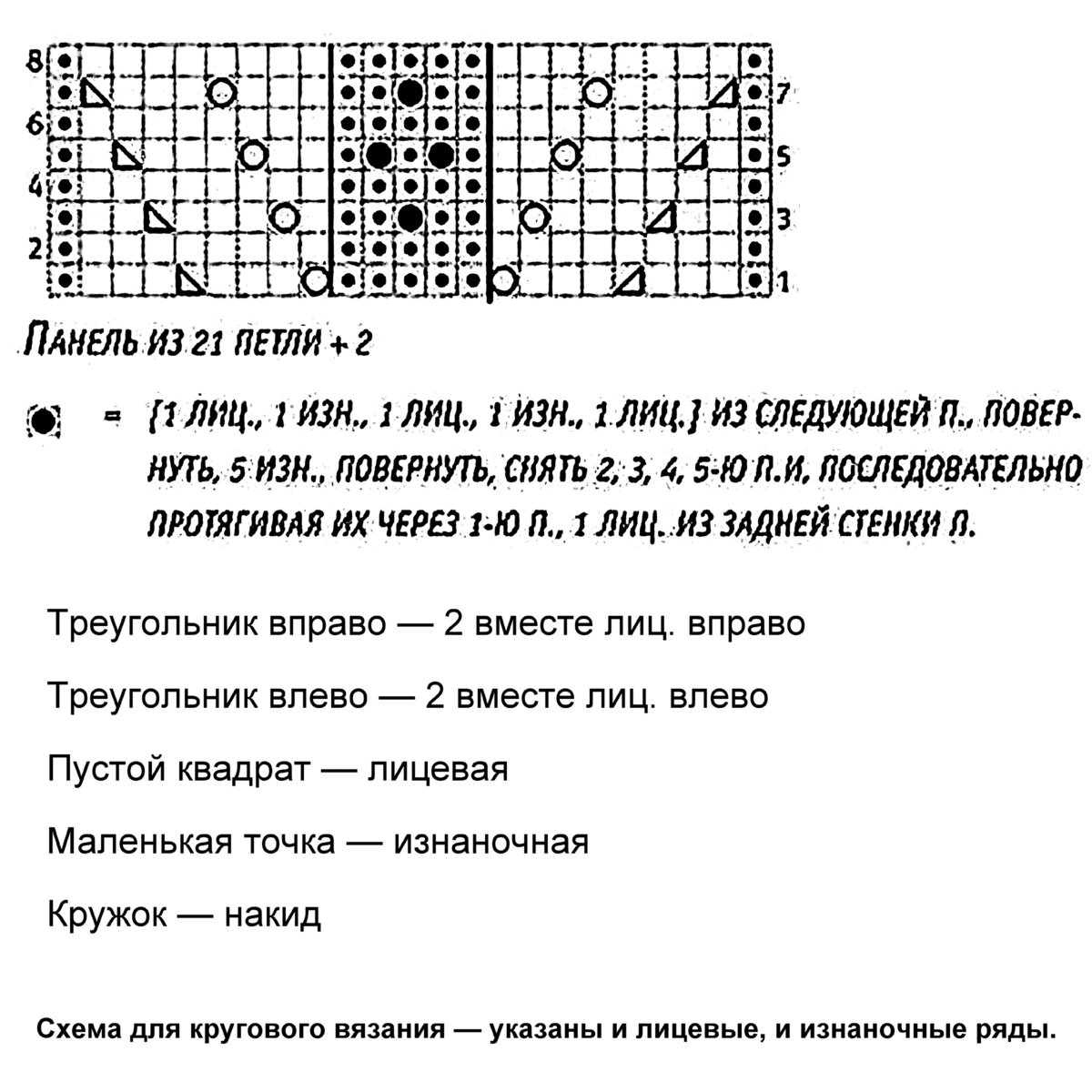 Раппорт узора 23 петли и 8 рядов в высоту. Схема для кругового вязания — указаны и лицевые, и изнаночные ряды. При поворотном вязании изнаночные (чётные) ряды на схеме можно опускать и вязать просто по рисунку.