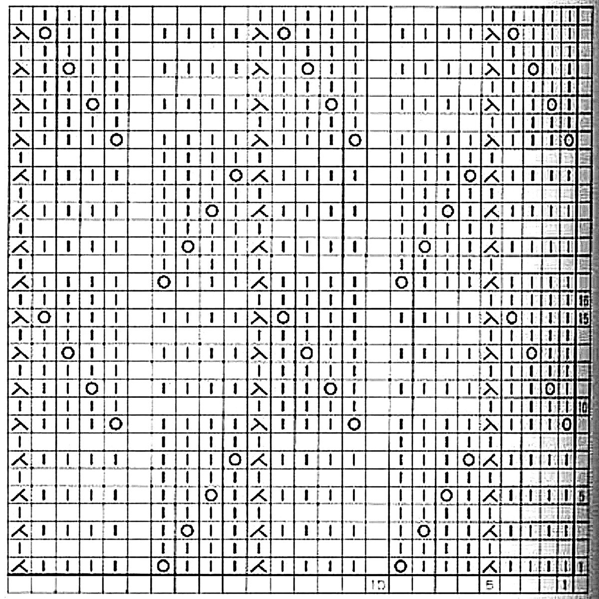 Раппорт узора всего 10 петель и 16 рядов в высоту. Обратите внимание, что схема для кругового вязания — указаны и лицевые, и изнаночные ряды. При вязании поворотными рядами отзеркаливайте условные обозначения в чётных (изнаночных) рядах.
