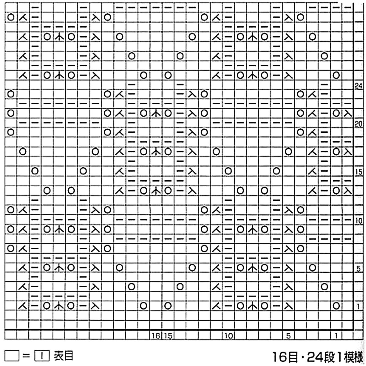 Раппорт узора 16 петель и 24 ряда в высоту. Схема для кругового вязания — указаны и лицевые, и изнаночные ряды. При вязании поворотными рядами необходимо будет добавить ещё 12 петель к общему количеству, и заканчивать ряд петлями, которые идут на схеме после основного раппорта.