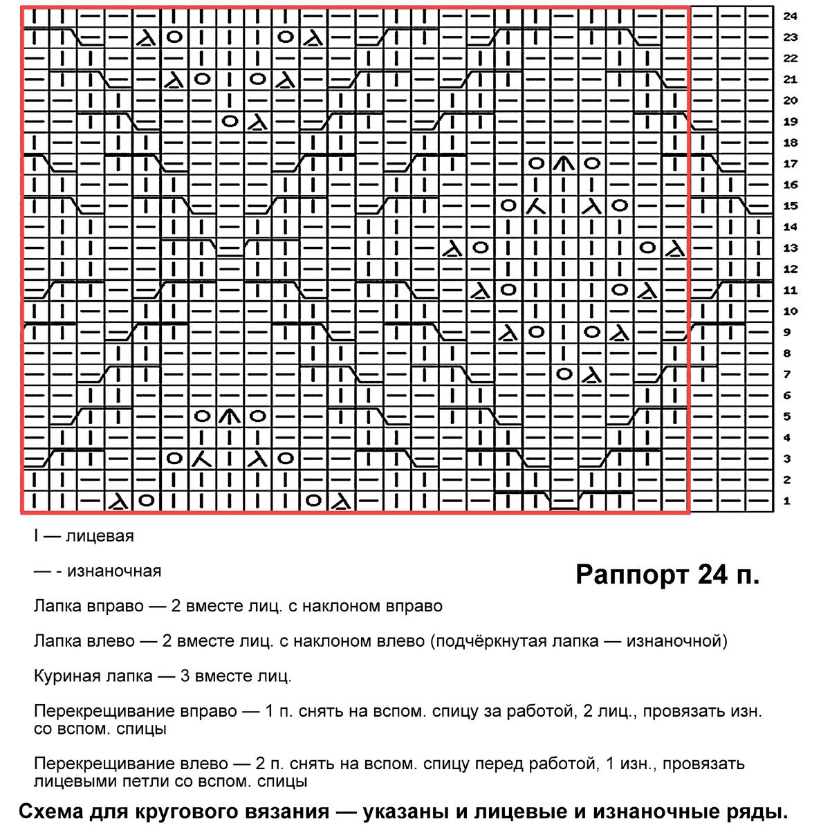 Раппорт узора 24 петли и 24 ряда в высоту. Схема для кругового вязания — указаны и лицевые (нечётные) и изнаночные (чётные) ряды. Изнаночные ряды при поворотном вязании просто вяжем по рисунку.