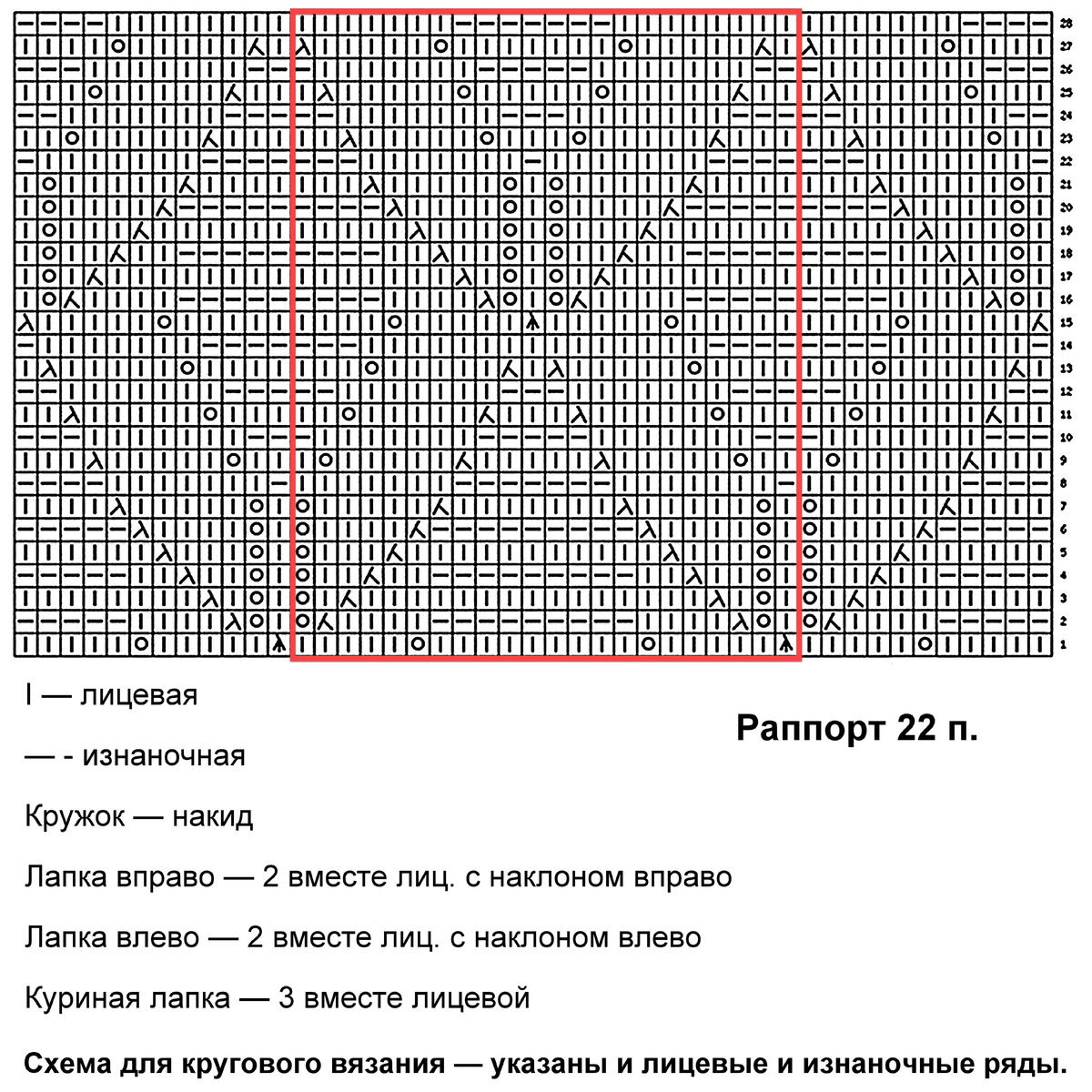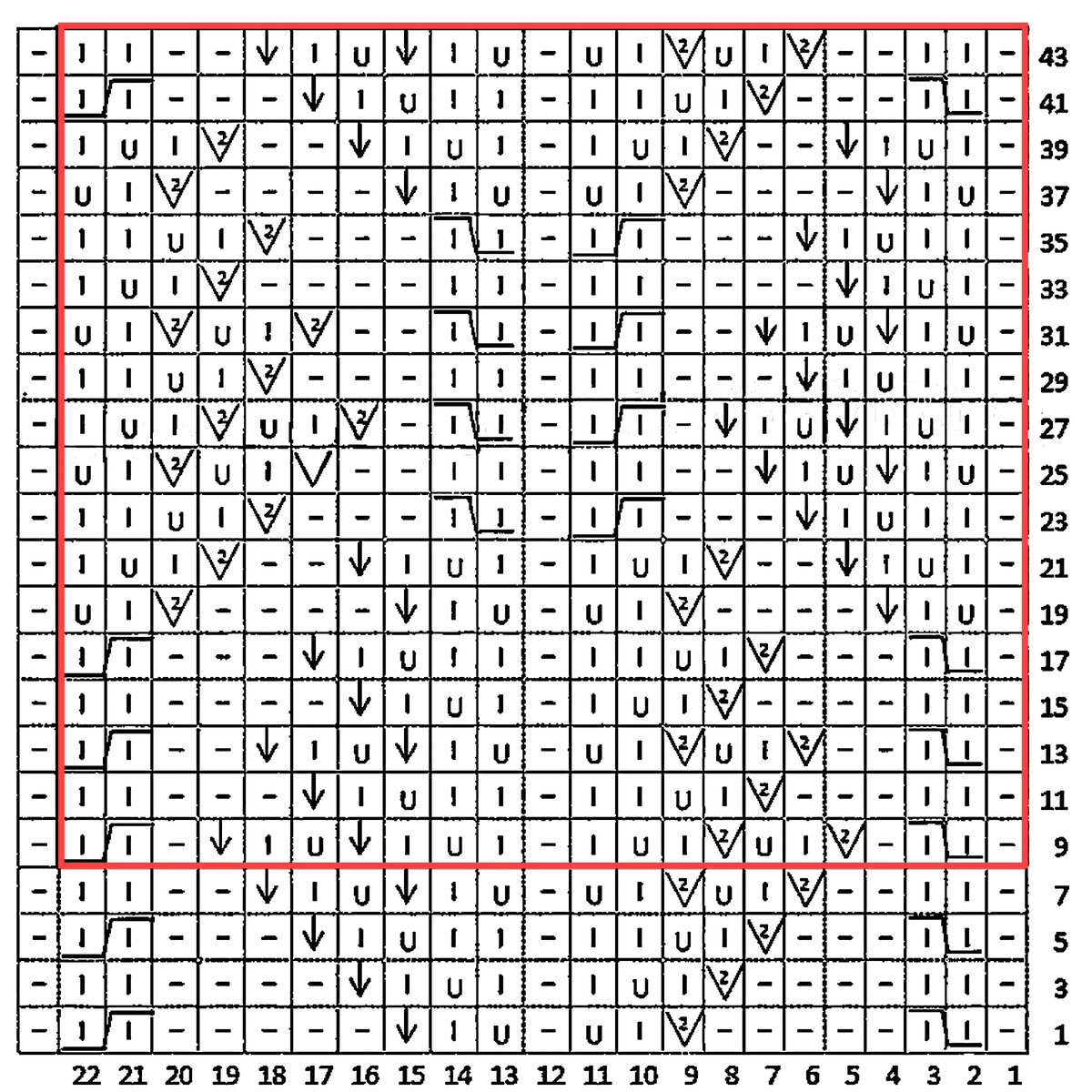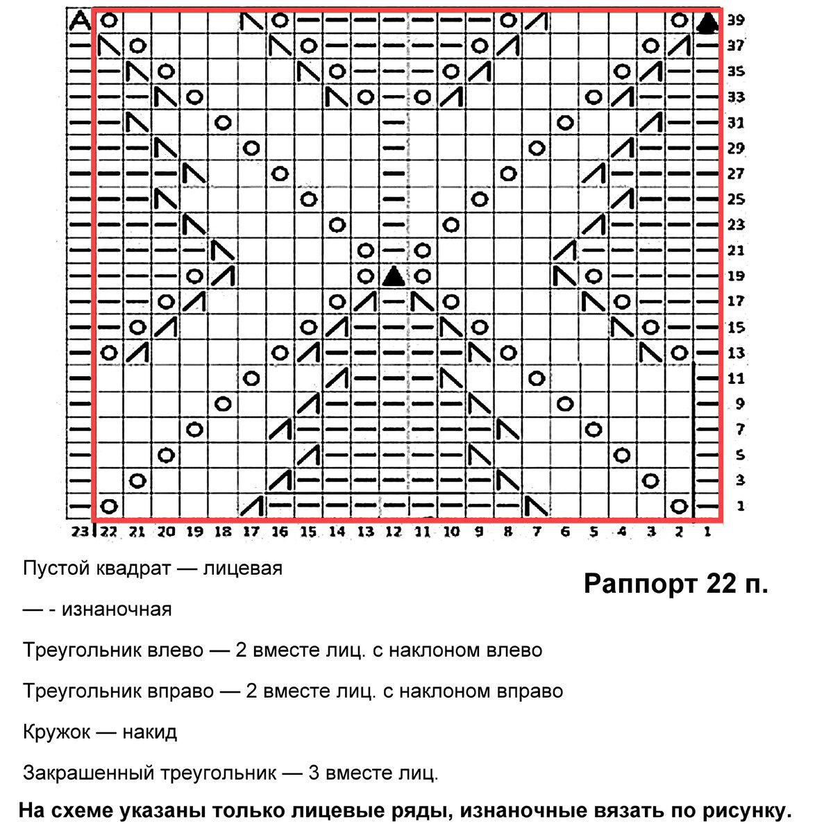 Раппорт узора 22 петли (плюс ещё одна петля для симметрии, если вяжете поворотными рядами) и 36 рядов в высоту. На схеме указаны только лицевые (нечётные ряды), изнаночные (чётные) вязать по рисунку.
