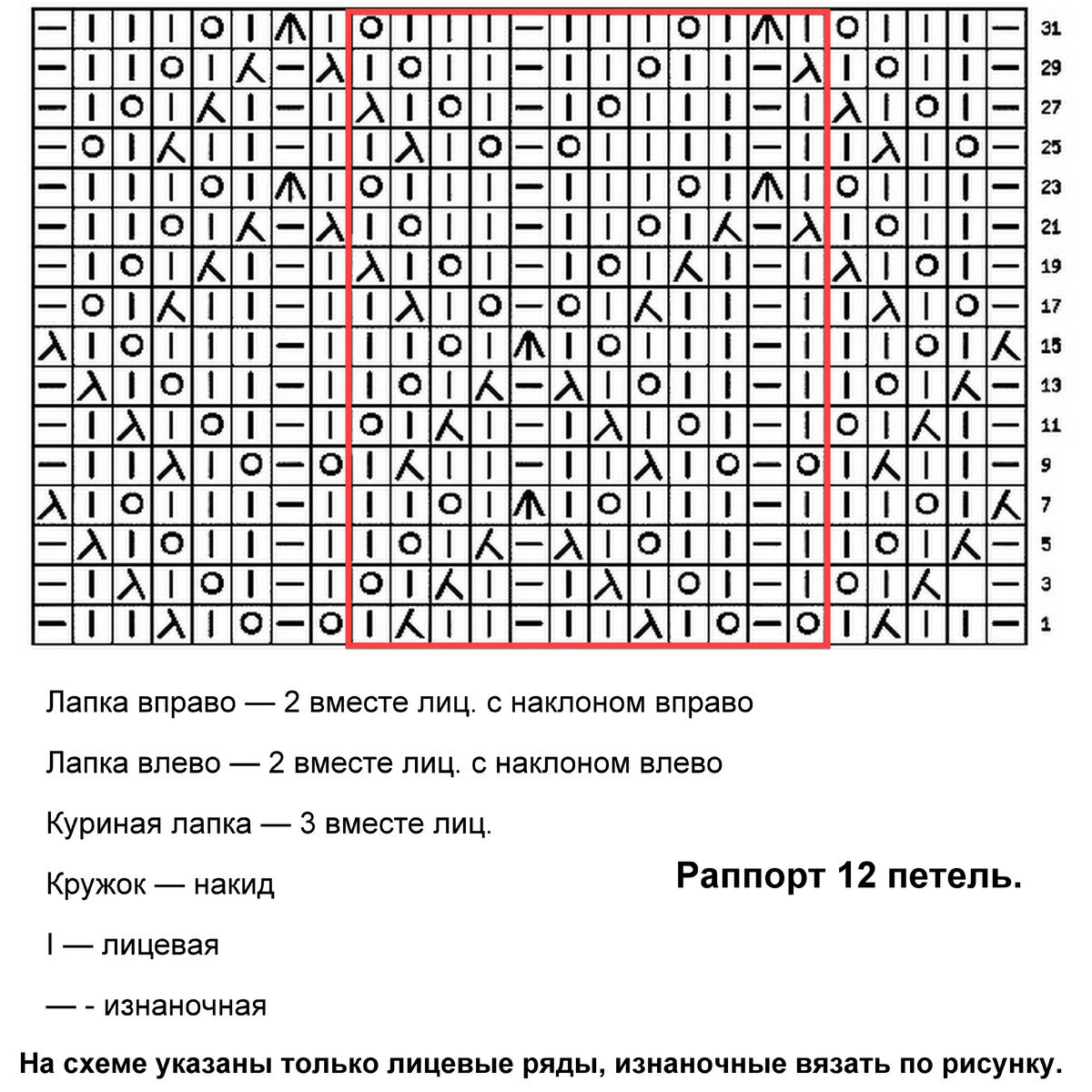 Раппорт узора 12 петель и 32 ряда в высоту. На схеме указаны только лицевые (нечётные ряды), изнаночные (чётные) вязать по рисунку. Если планируете вязать поворотными рядами, добавьте к основному количеству раппортов одну петлю и начинайте ряд петлями до раппорта, заканчивая петлями после раппорта, указанными на схеме.