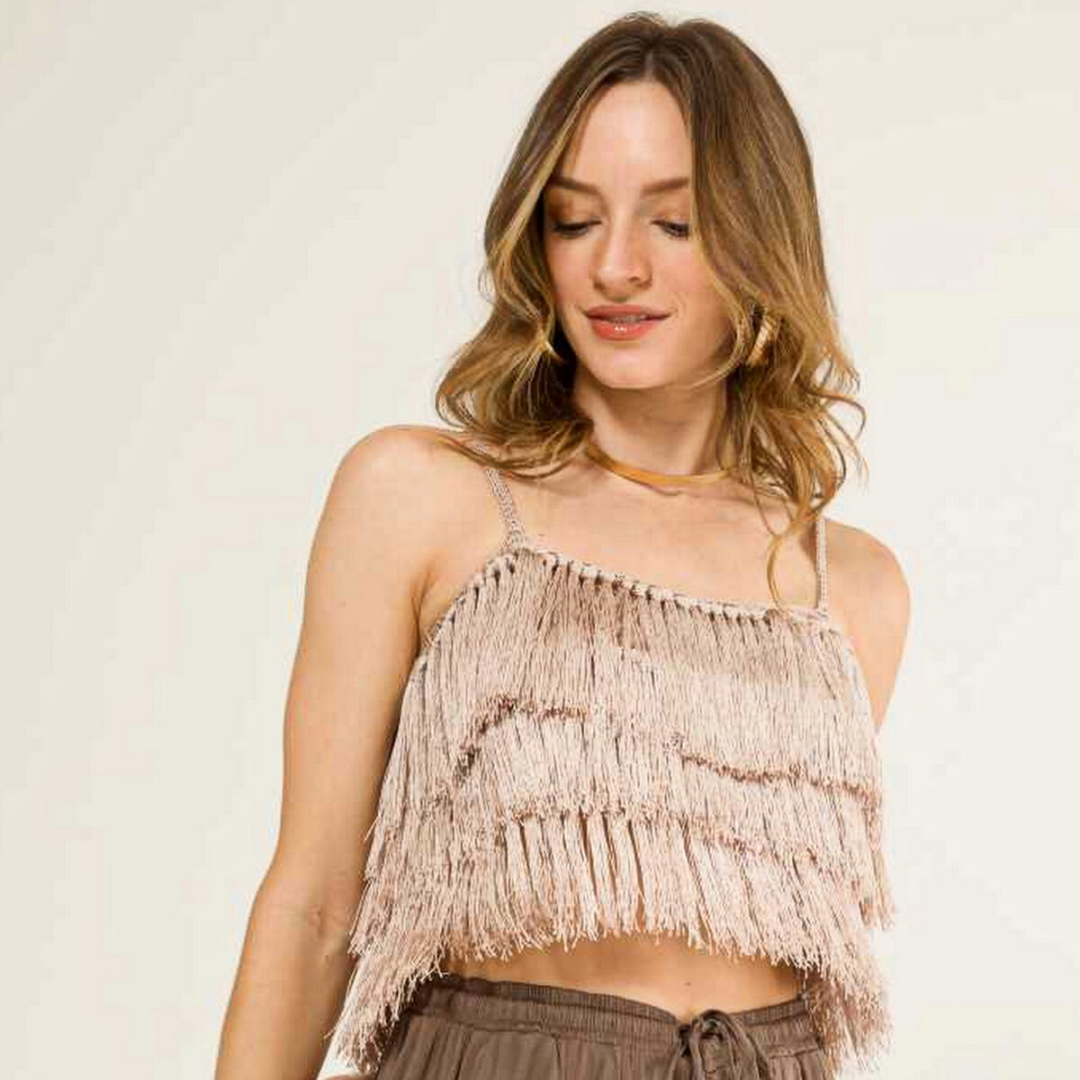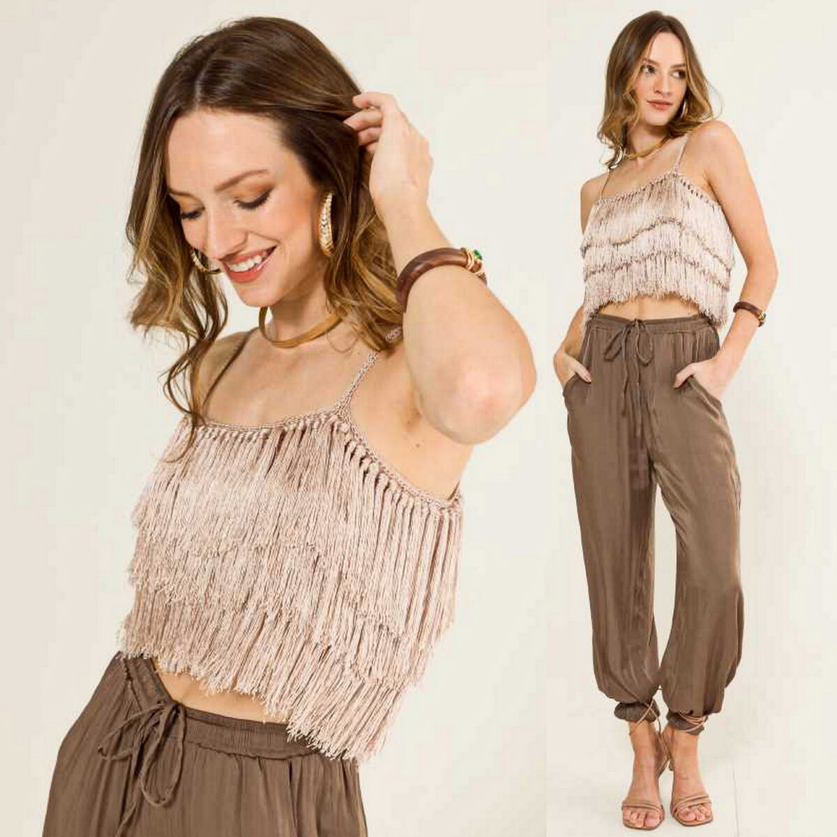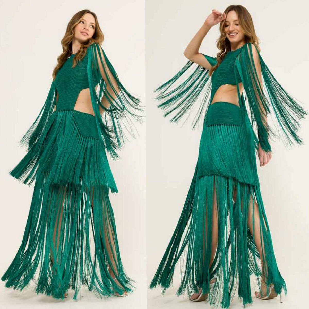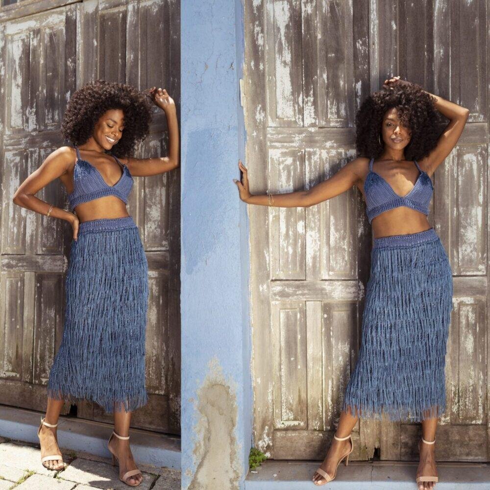 Поистине коктейльный наряд — кроп-топ на тонкий бретелях и юбка ниже колена, густо украшенная струящейся бахромой.