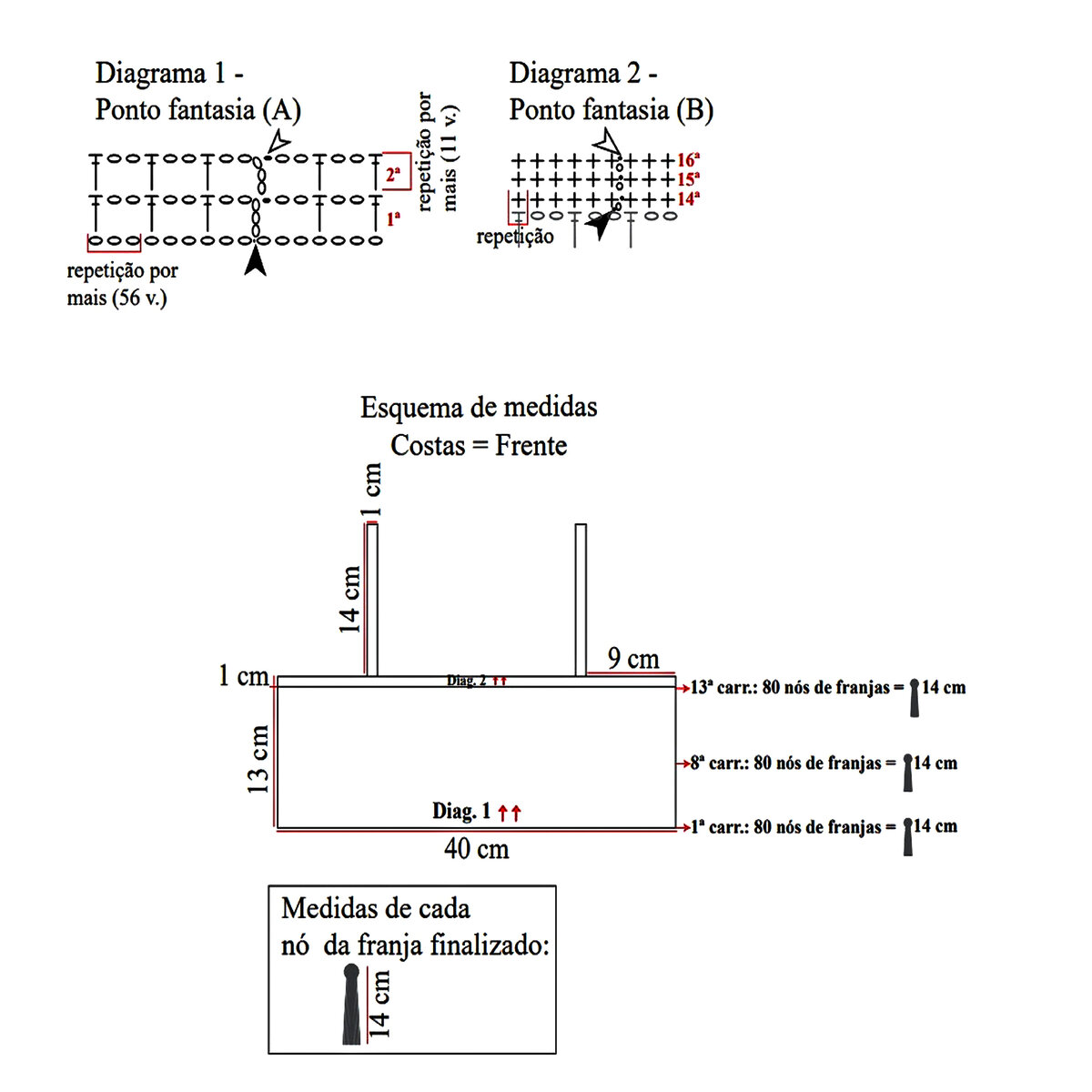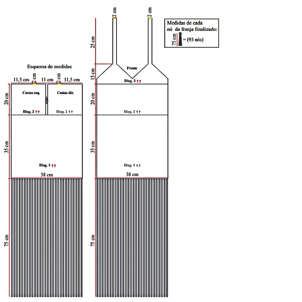 Начнём с самого главного — как приделать бахрому. Проще простого! Для этого нарезаем нити нужной длины. Складываем вместе по 4-5 полос пополам и протаскиваем крючком по краю, как указано на схеме.