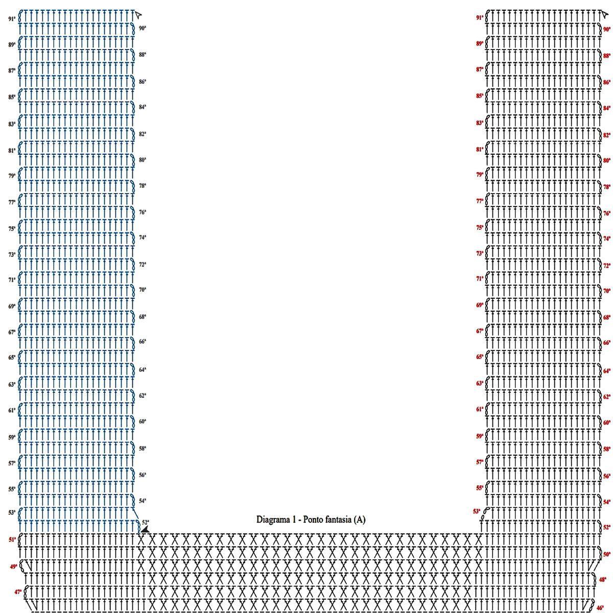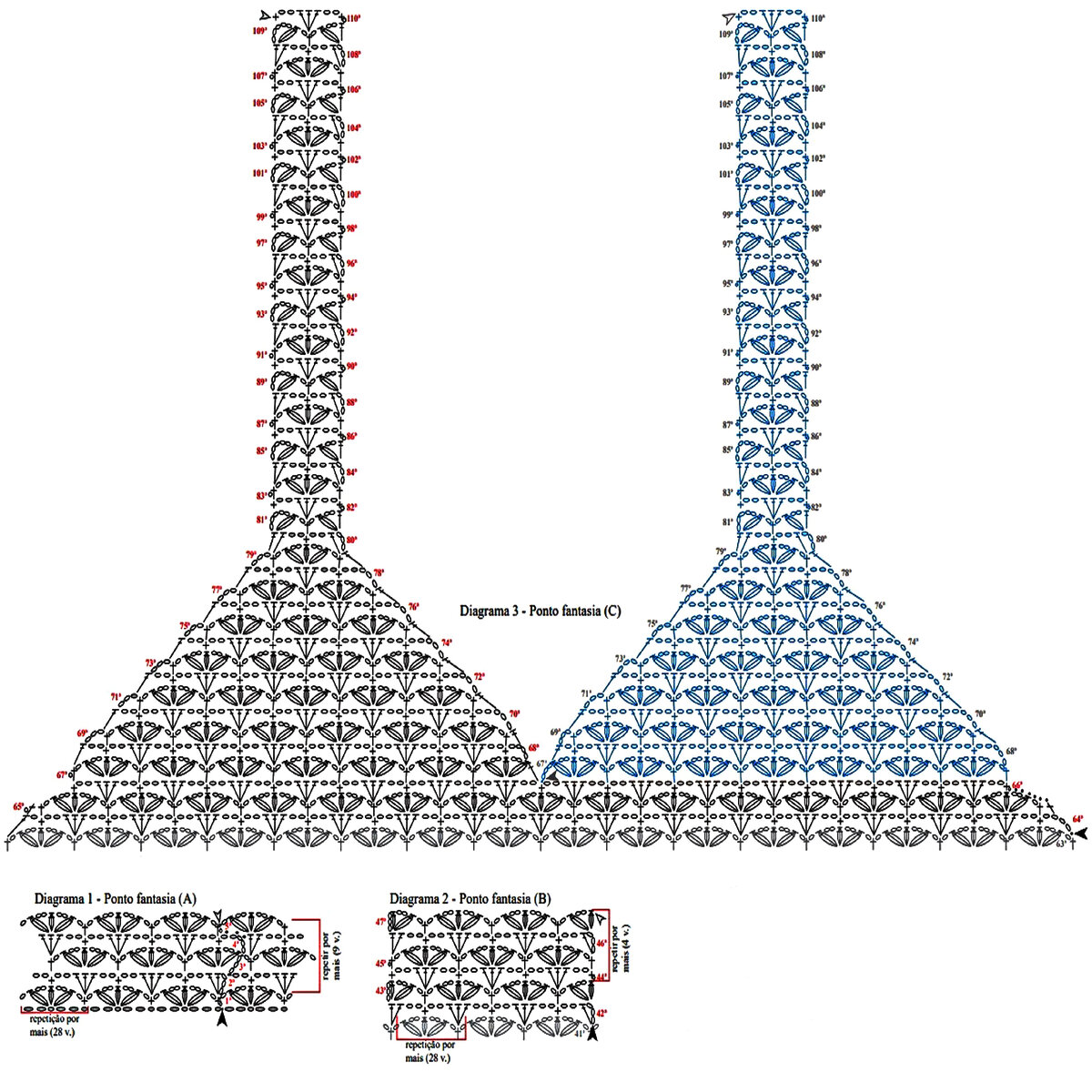 Для вязания этой шикарной модели нам потребуется 12 мотков синей пряжи (для ажурной подкладки: 100% мерсеризованный хлопок; 50 гр — 167 м) и 6 мотков пряжи на тон светлее (для бахромы: 100% вискоза; 100 гр — 240 м) — на размер 44-46. Крючок № 1,75-2. А также молния длиной 32 см.