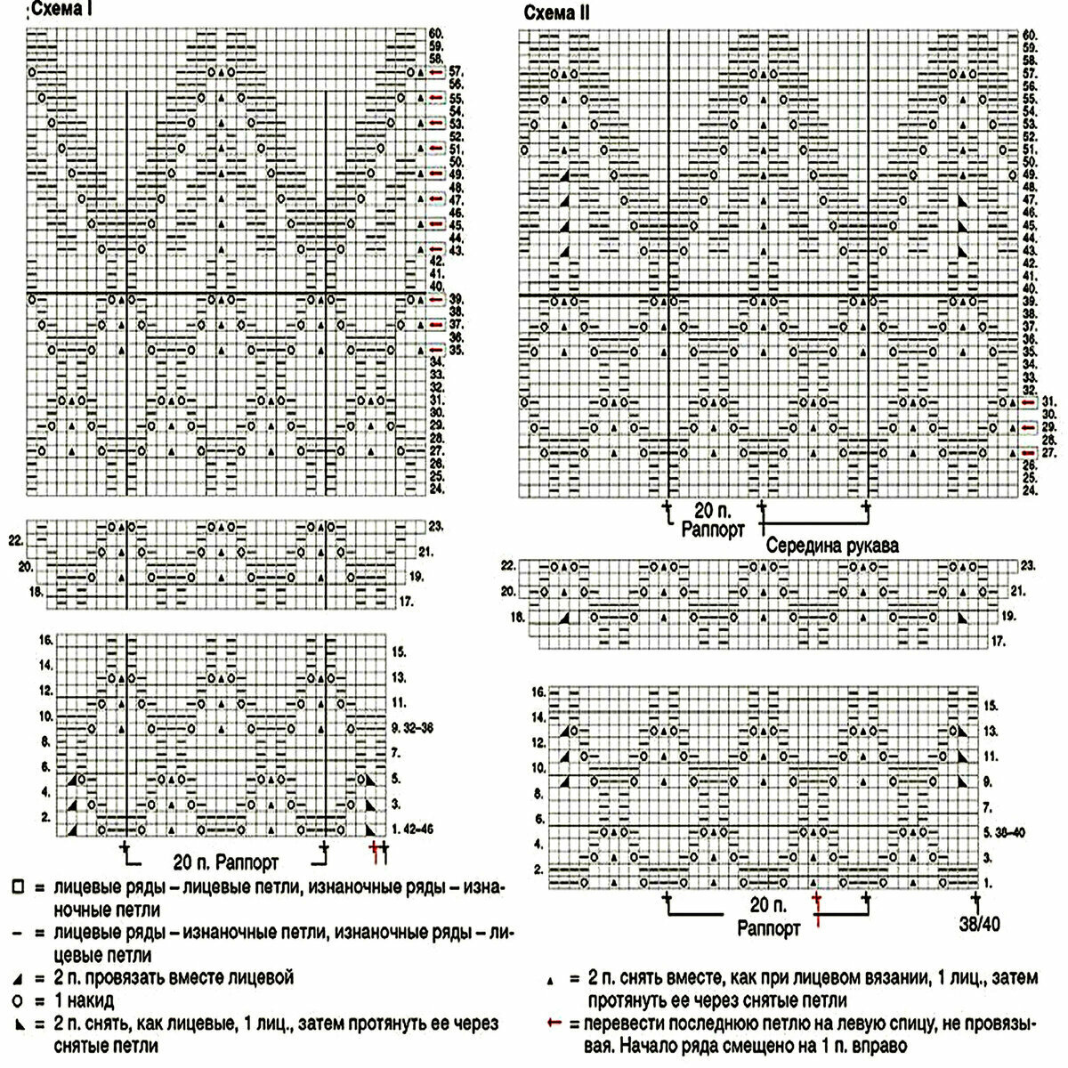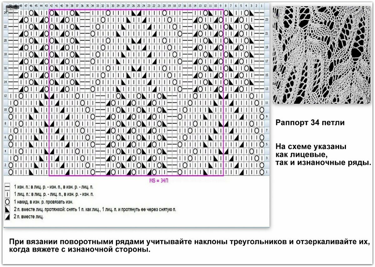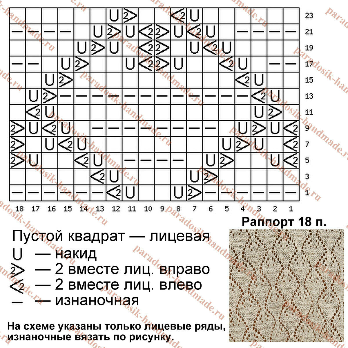 Раппорт 18 петель и 24 ряда в высоту. На схеме указаны только лицевые (нечётные) ряды, изнаночные (чётные) вязать по рисунку.