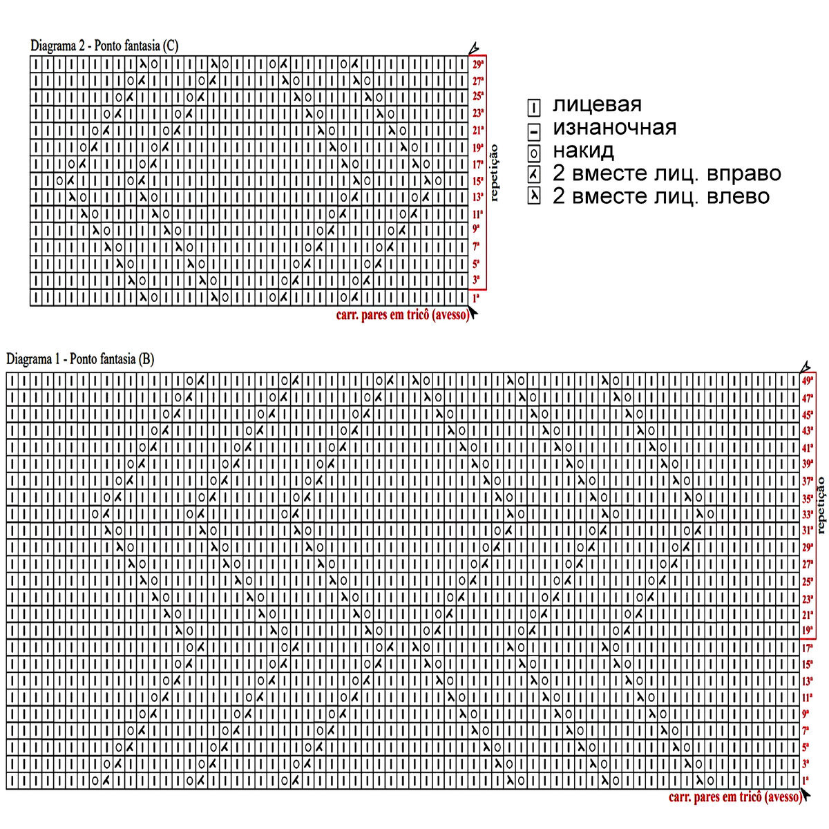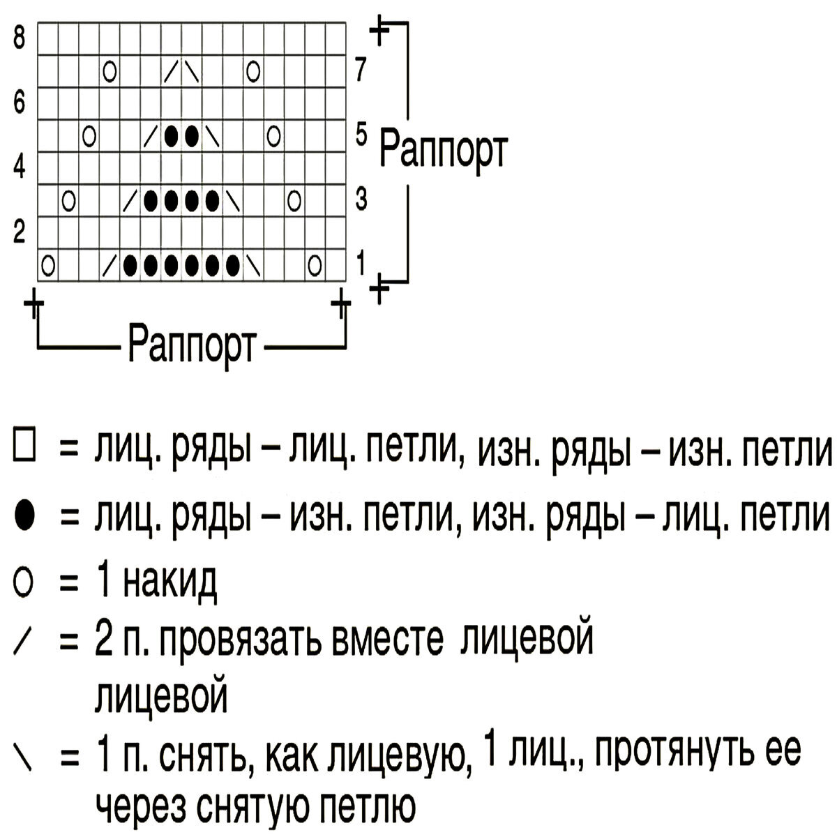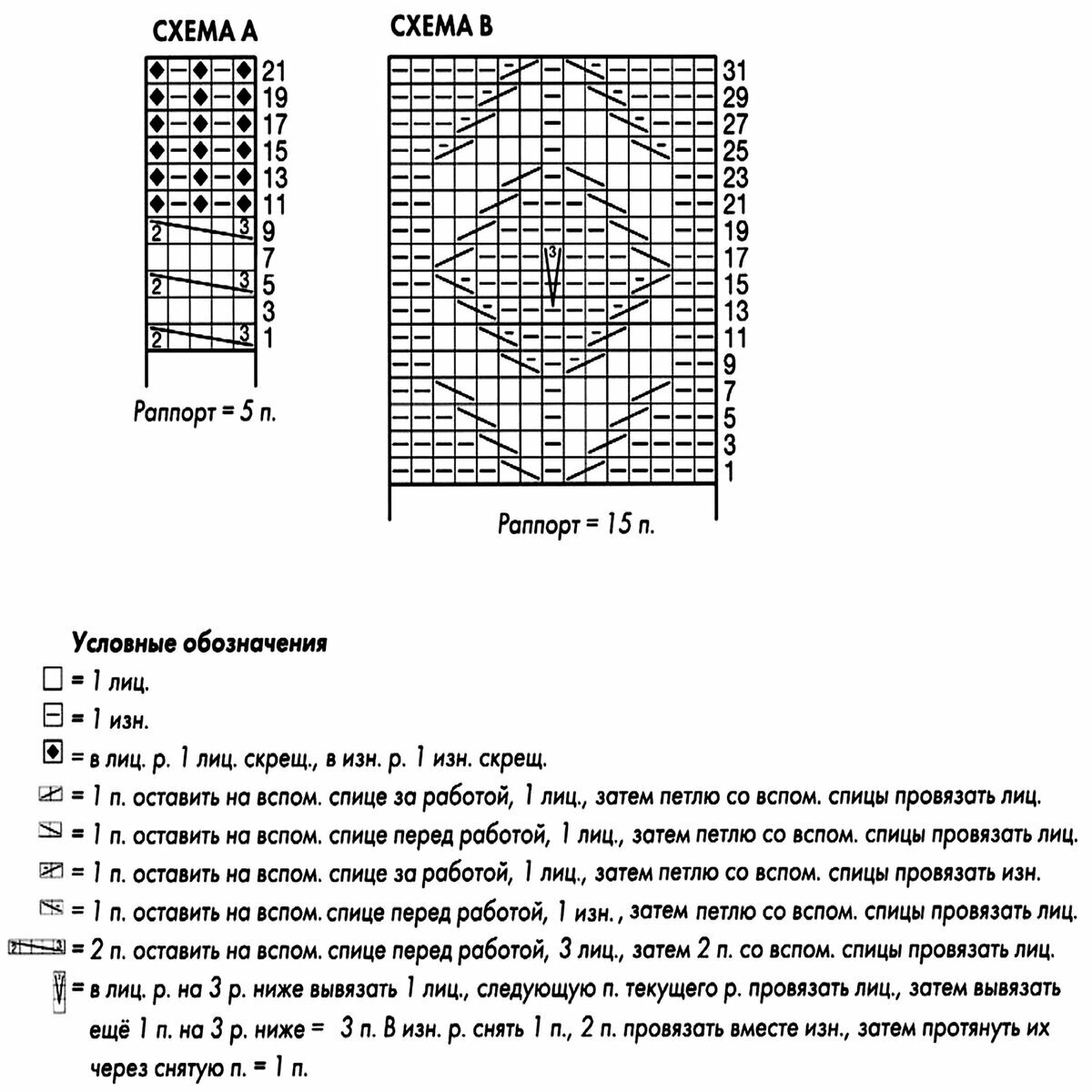 Раппорт 18 петель и 24 ряда в высоту. На схеме указаны только лицевые (нечётные) ряды, изнаночные (чётные) вязать по рисунку.